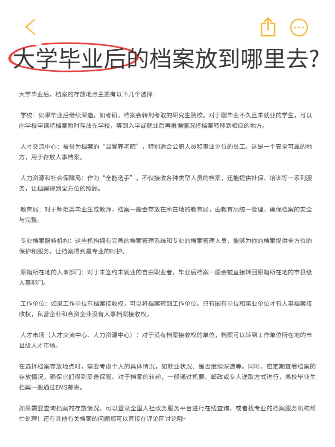 学校:如果毕业后继续深造,如考研,档案会转到考取的研究生院校。对于刚毕业不久且未就业的学生,可以向学校申请将档案暂时存放在学校,等到入学或就业后再根据情况将档案转移到相应的地方。