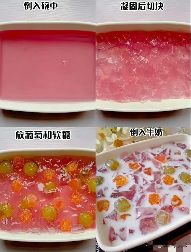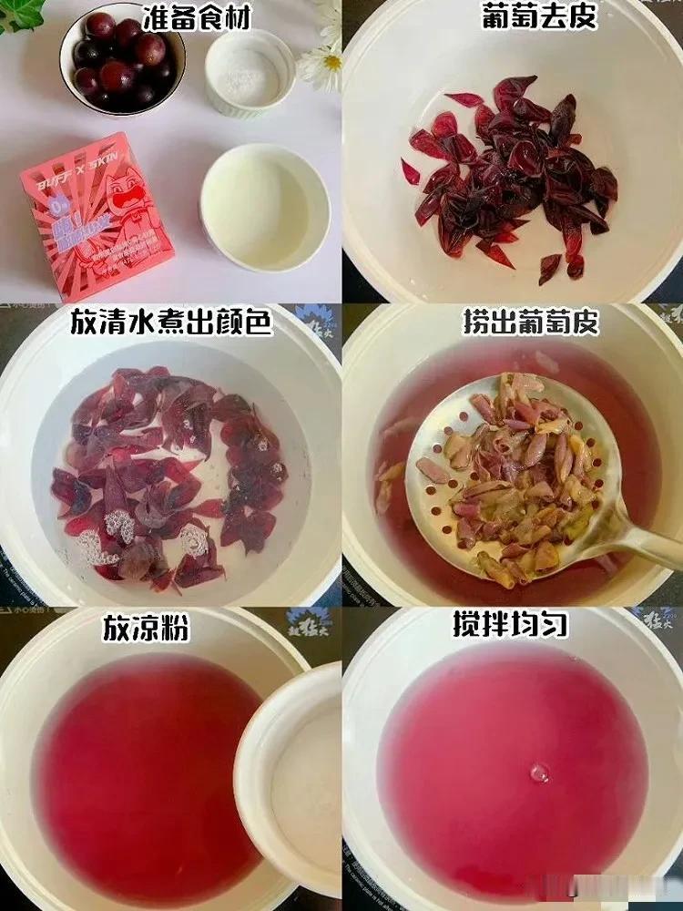 酸甜嫩滑爽口,葡萄牛奶果冻,巨美味!! 食材: 软糖适量,紫葡萄20颗,凉粉30g,牛奶100g,清水700ml 做法: 1.准备食材,葡萄记得在水中放盐和一勺面粉浸泡洗净。 2.葡萄去皮,葡萄皮放锅中,加入700ml清水煮出颜色,捞出葡萄皮,放凉粉,搅拌均匀关火。 3.倒入容器中,凝固后用刀划成小块,放软糖和葡萄果肉,倒入牛奶即可享用啦!放冰箱中冷藏一下更美味!#秋日生活打卡季# #记录我的9月生活# #甜品食谱分享#