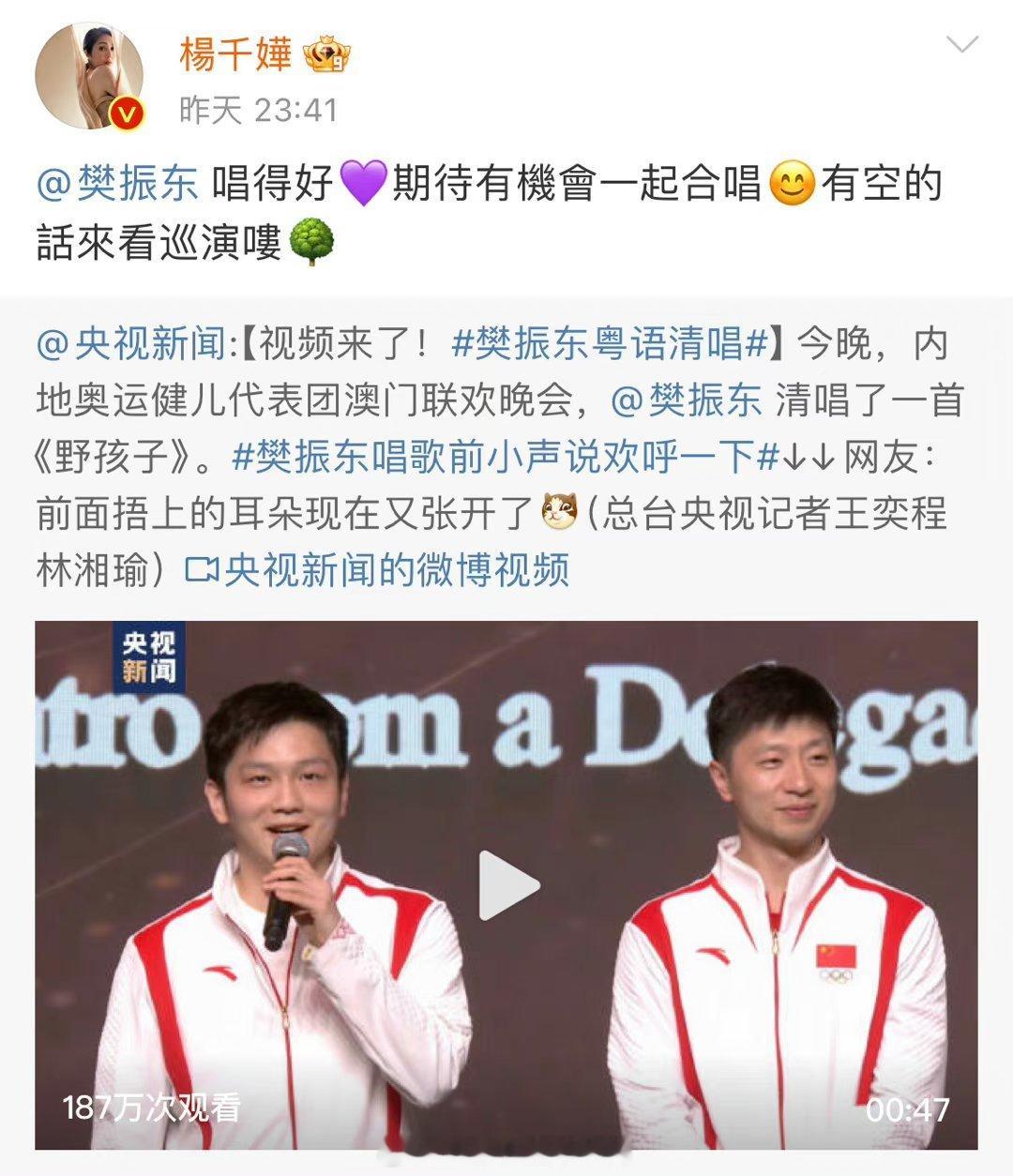 #樊振东同时被陈奕迅杨千嬅邀请##樊振东先天追星圣体#