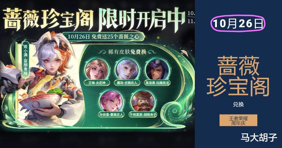 该活动10月17日逐步开启,结束时间为11月6日,和往常蔷薇珍宝阁相同,大家可以使用蔷薇之心兑换皮肤,兑换需要蔷薇之心150个,10月26日-28日登陆可领取25个蔷薇之心。