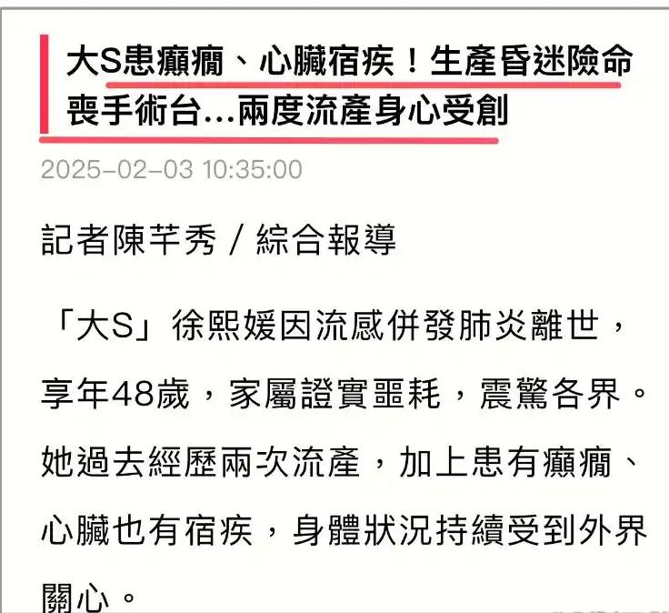 当初在生二胎的时候,大S其实身体状况就已经不是很好了,因为她有严重的癫痫。