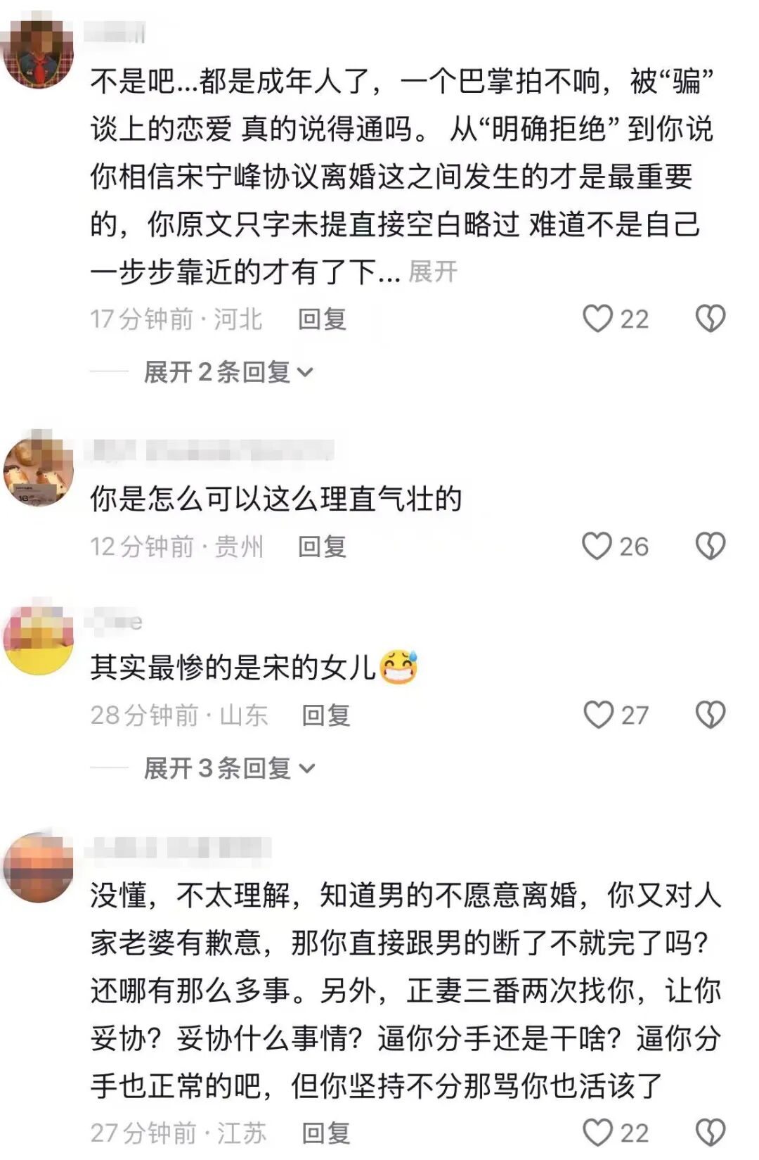 但是也有另一些人认为,把所有的道德谴责都集中到两个女人身上本身就是一件荒唐的事情。宋宁峰才是这场闹剧真正的制造者——他欺骗了Q小姐,背叛了张婉婷,在被揭穿之后第一时间找人替自己背锅,并且迅速消失。