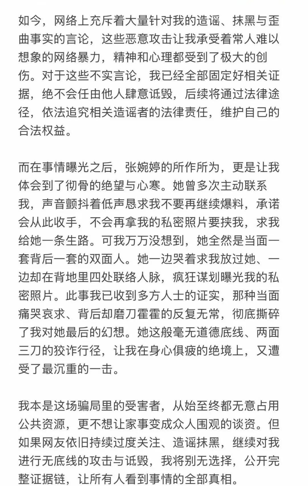 但是她后来通过各种渠道得知,张婉婷已经反悔了——私下里还在策划曝光她的私密照片,并且"不想给对方留活路"。