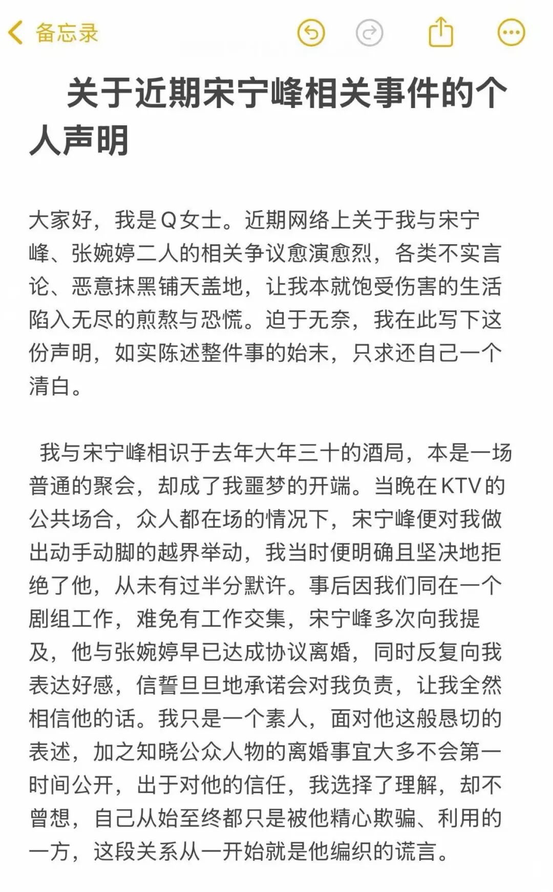 4月3日深夜,宋宁峰出轨事件中一直保持沉默的"Q小姐"突然公开现身,并发布长文声明称自己被精心设局欺骗、张婉婷用私密照片威胁逼迫,在这场闹剧中她才是最大的受害者。