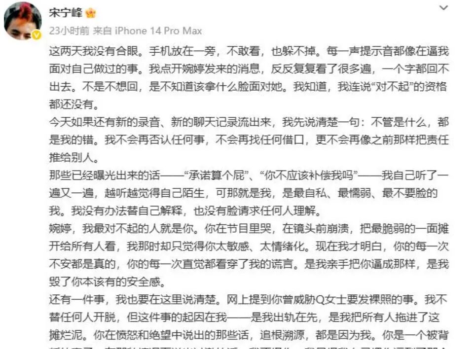 2025年1月,宋宁峰在商务酒局中认识了Q小姐,并以"即将离婚"为由展开追求,在这之后两人维持着长达一年半的关系,期间多次幽会,男方还曾带五岁的女儿一起赴约。2026年3月14日,张婉婷有所察觉,宋宁峰立刻要求Q小姐统一口径对外称"只是普通聊天"来掩盖一切。3月15日,事情无法再隐瞒了,宋宁峰翻脸不认账,在Q小姐面前说"承诺算个屁,并且指责她破坏了他的家庭。3月17日,张婉婷威胁要公布Q小姐的私密照片。3月31日,Q小姐忍无可忍后公开了7分48秒的录音以及大量的聊天记录,在这些证据面前宋宁峰主动勾引、带女出轨并事后推卸责任的行为全部被证实。4月1日,宋宁峰发文公开承认出轨,并向妻子和女儿以及公众道歉,宣布无限期退出娱乐圈。4月2日,娱记又曝出:宋宁峰在3月下旬公开道歉之前就和Q小姐深夜密谈了6个小时左右,并且言行大相径庭被全网痛批。4月3日晚上,Q小姐发布了本文开头的声明。宋宁峰自4月1日道歉声明发布之后就彻底消失不见,在整个事件中一直保持着完美的隐身状态。