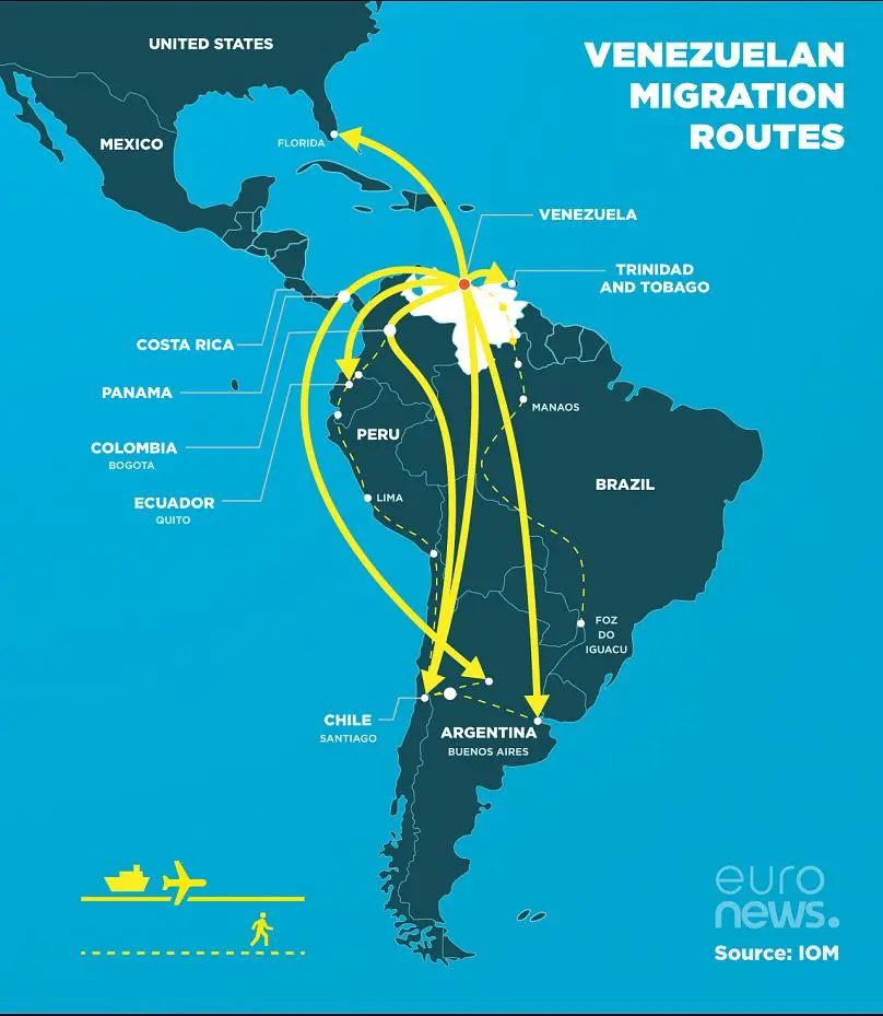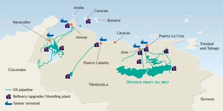 委内瑞拉是世界石油最多的国家之一,途中蓝绿色线即输油管道,可以看到马拉开波湖附近很密集