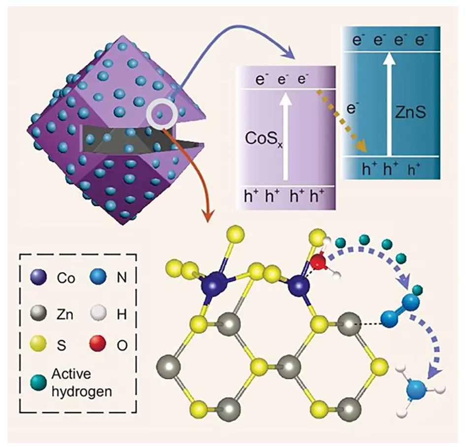 ;光激发后,ZnS的CB低能电子与ZnO的VB低能空穴复合,而ZnO的CB高能电子可高效还原O2⁻,ZnS的VB高能空穴可氧化H2这种。