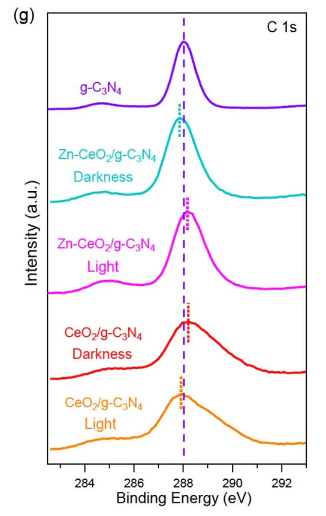 Zn-CeO2Ce 3d而光照后,Ce 3d 结合能向高值偏移(ΔE≈0.2 eV),C 1s 结合能向低值偏移(ΔEb≈0.18 eV),根据公式 ΔE= k·Δn。