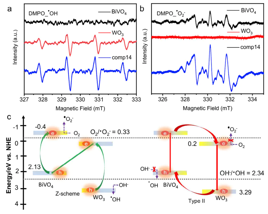 2,表明其价带(VB)电势>+0.81 V、导带(CB)电势<-0.33 V,即保留了高能载流子,符合S-型异质结特征如图6 BiVO4/WO3异质结的ESR测试显示仅检测到•O2⁻);