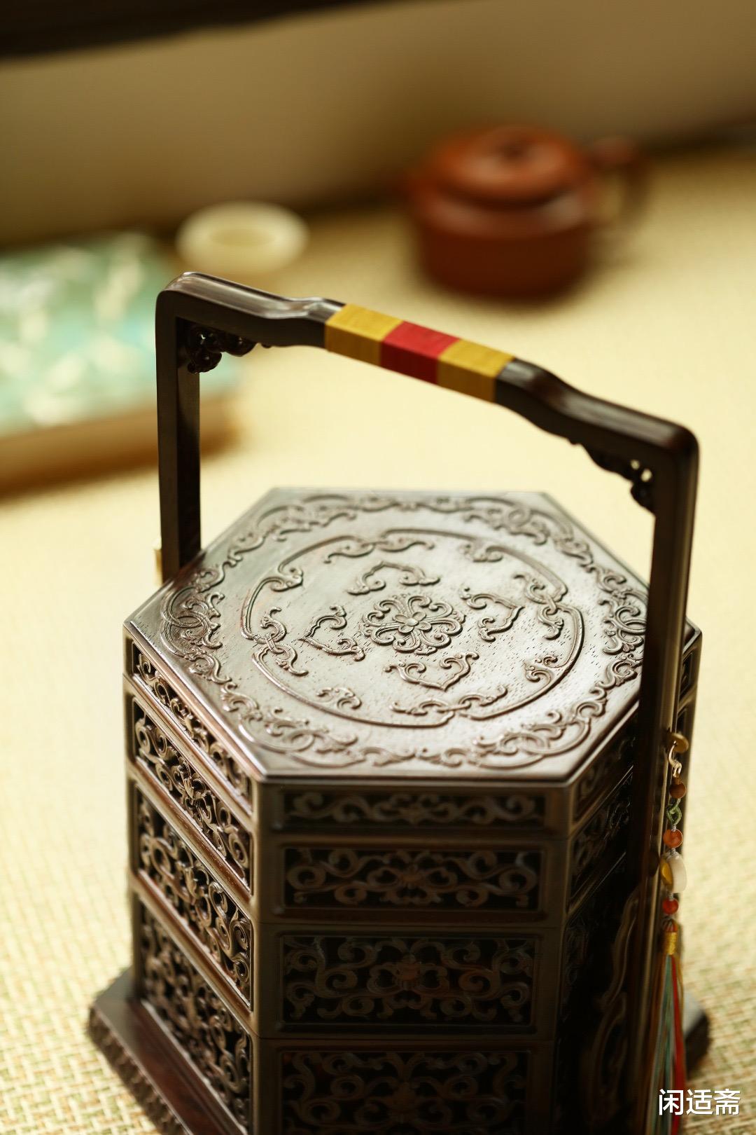 提盒采用三层独立设计,分层清晰、大小适中,收纳有序不杂乱,可按需分类存放物品——茶室中可收纳茶饼、茶针、茶宠、茶具等茶事好物,书房里可存放笔墨纸砚、印章印泥等文房用品,日常也可收纳小件古玩、首饰等,一物多用,适配多场景。