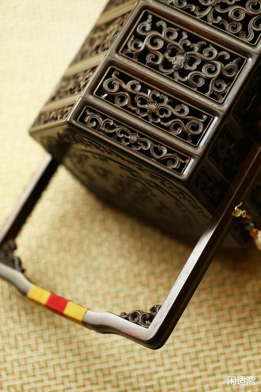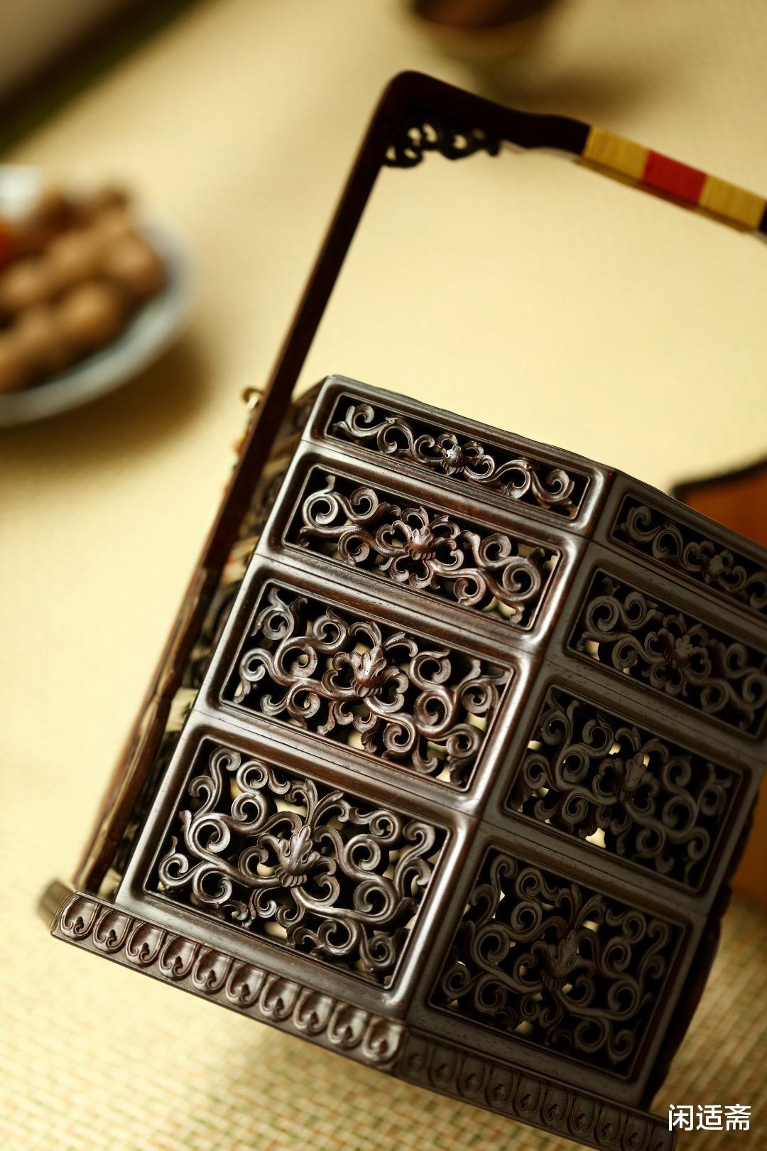 提盒周围采用传统透雕工艺,精雕细琢卷草纹,纹路连绵不绝、婉转流畅,雕刻精细立体、繁而不杂,既有古朴雅致的韵味,又暗含“生生不息、吉祥绵长”的美好寓意。透雕工艺不仅彰显了匠人的精湛技艺,更让提盒兼具透气性,避免盒内物品受潮,实用与美学完美融合,每一处纹路都尽显中式雅韵。