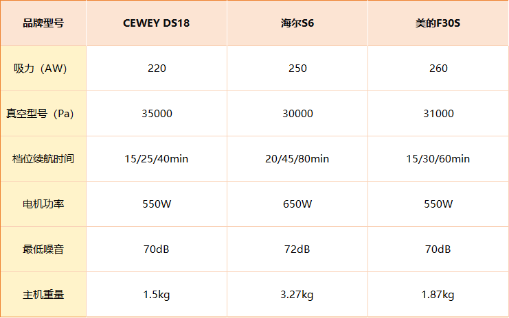 从上面的数据可以看出CEWEY DS18在真空度与动力系统上展现出强劲实力。电机转速12万转/分钟,稳定输出强劲吸力,适合深度清洁场景。海尔S6与美的F30S的吸力相对来说都挺高的,但在真空度上低于CEWEY,整体吸附效率稍弱。总体来说,CEWEY性能更平衡些,能兼顾吸力与能耗稳定性。