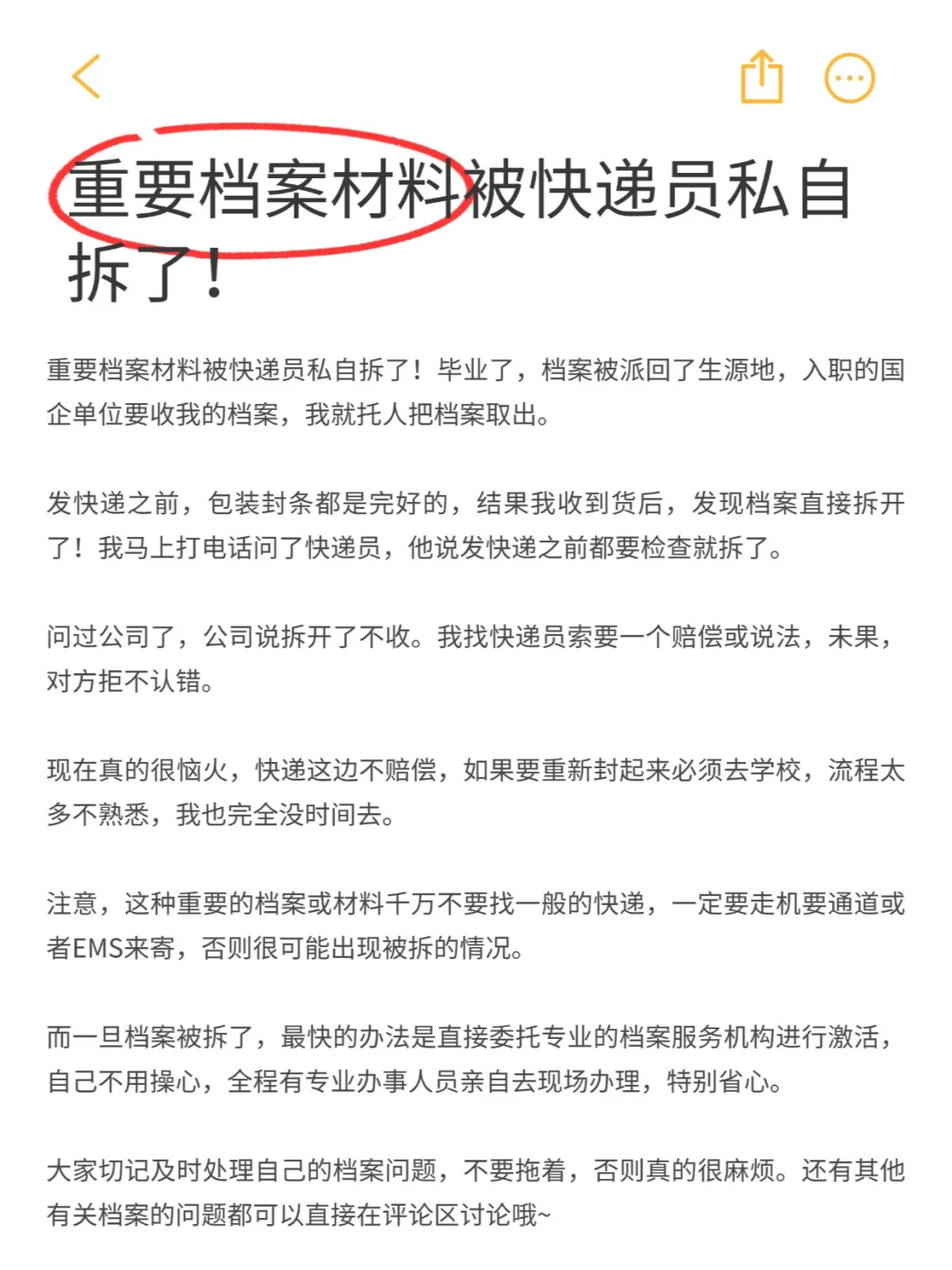 重要档案材料被快递员私自拆了!毕业了,档案被派回了生源地,入职的国企单位要收我的档案,我就托人把档案取出。