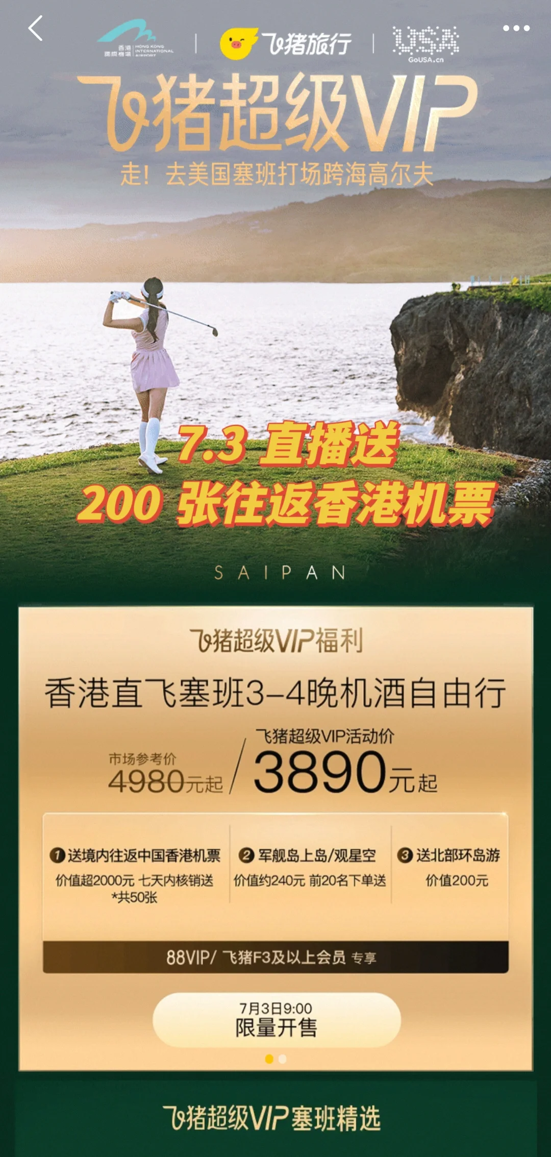 但是目前香港开通了直飞塞班岛的航线,当我在多个平台查询「怎么飞塞班岛最划算」的时候,发现飞猪藏了个大招,7月3日9点上飞猪 🔍“塞班给我冲”,进入「飞猪超级 VIP」直播,200 套香港往返内地机票🆓送!还有超多优惠套餐,「香港」直飞「塞班岛」往返才3099💰,单程也就1500💰,真的非常划算。