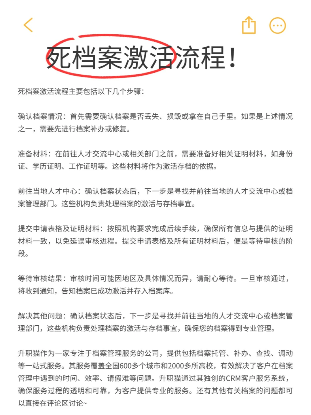 升职猫作为一家专注于档案管理服务的公司,提供包括档案托管、补办、查找、调动等一站式服务。其服务覆盖全国600多个城市和2000多所高校,有效解决了客户在档案管理中遇到的时间、效率、请假难等问题。升职猫通过其独创的CRM客户服务系统,确保服务过程的透明和可靠,为客户提供专业的服务。还有其他有关档案的问题都可以直接在评论区讨论~