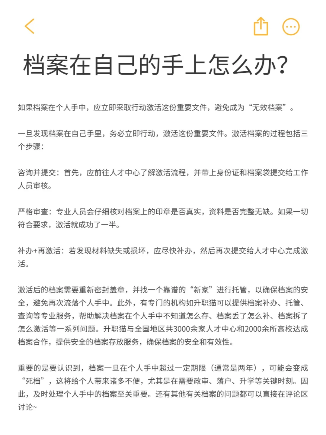 重要的是要认识到,档案一旦在个人手中超过一定期限(通常是两年),可能会变成“死档”,这将给个人带来诸多不便,尤其是在需要政审、落户、升学等关键时刻。因此,及时处理个人手中的档案至关重要。还有其他有关档案的问题都可以直接在评论区讨论~