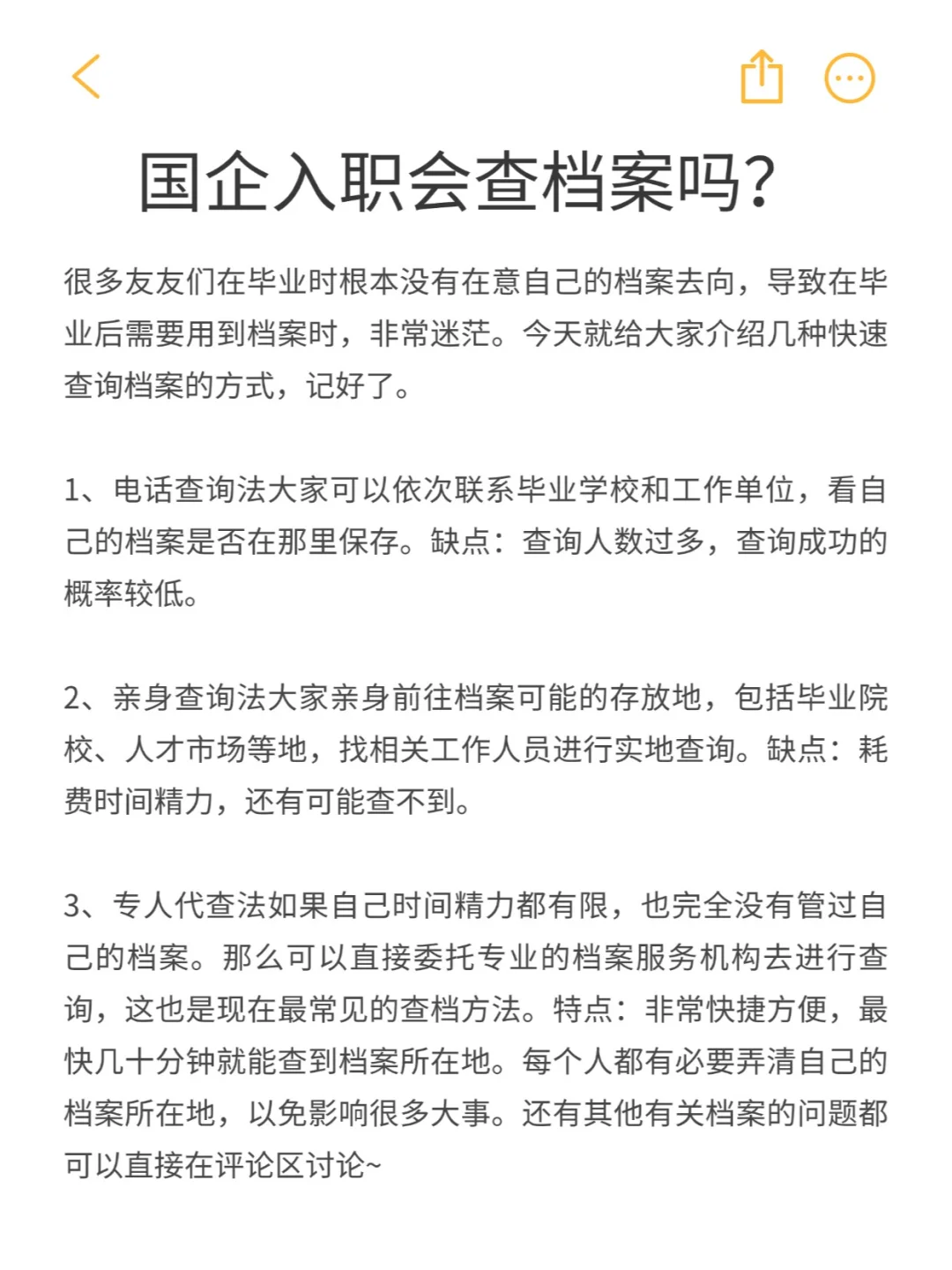 3、专人代查法如果自己时间精力都有限,也完全没有管过自己的档案。那么可以直接委托专业的档案服务机构去进行查询,这也是现在最常见的查档方法。特点:非常快捷方便,最快几十分钟就能查到档案所在地。每个人都有必要弄清自己的档案所在地,以免影响很多大事。还有其他有关档案的问题都可以直接在评论区讨论~