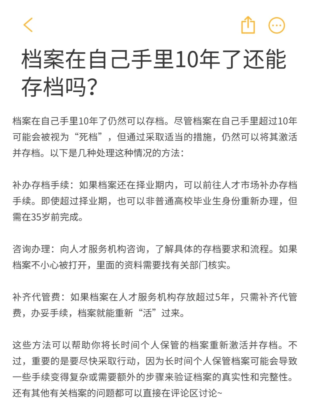 档案在自己手里10年了仍然可以存档。尽管档案在自己手里超过10年可能会被视为“死档”,但通过采取适当的措施,仍然可以将其激活并存档。以下是几种处理这种情况的方法: