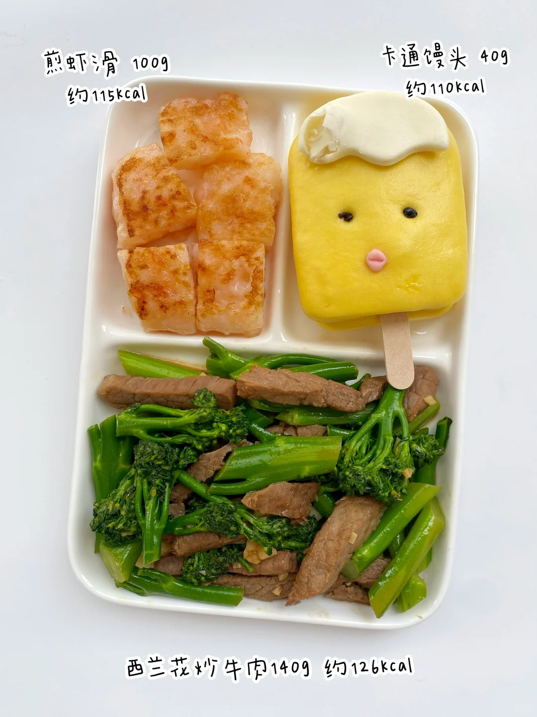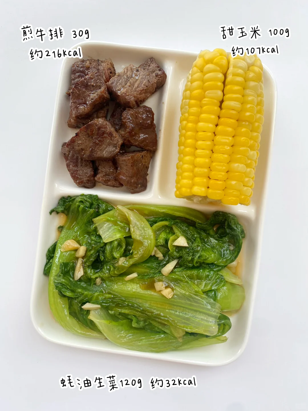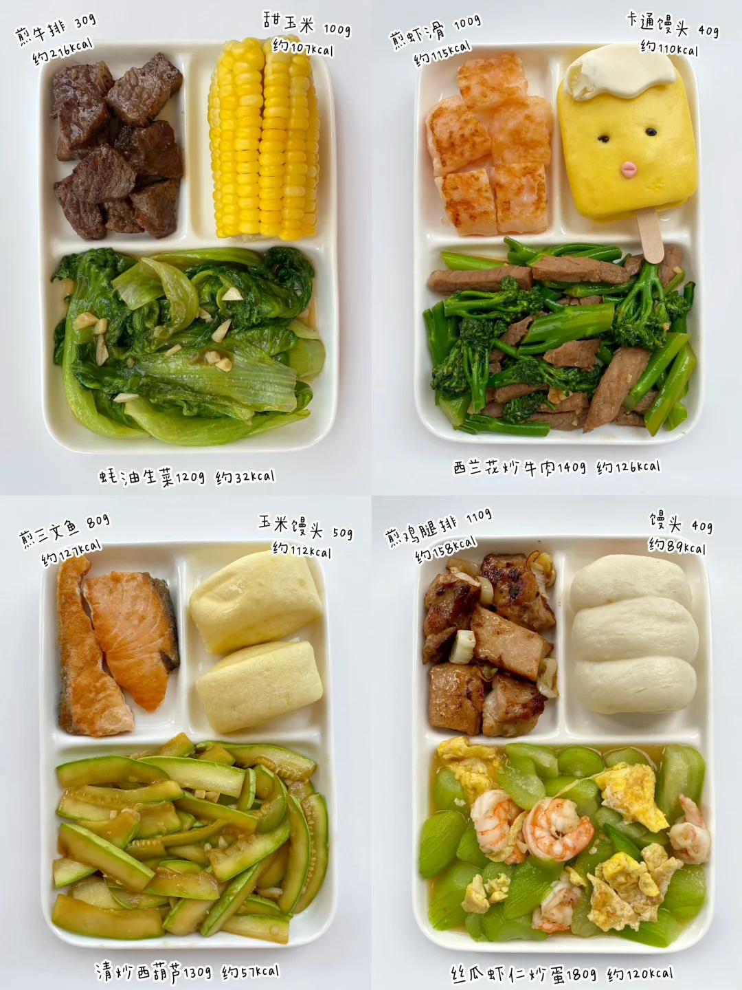 Day1️⃣ 煎牛排➕蚝油生菜➕甜玉米 Day2️⃣ 煎虾滑➕西兰花炒牛肉➕卡通馒头 Day3️⃣ 煎三文鱼➕清炒西葫芦➕玉米馒头 Day4️⃣ 煎鸡腿排➕丝瓜虾仁炒饭➕馒头 ~ 🎀我的饮食方式就是摄取足够的蛋白质,所以每餐吃的都满足😝,碳水确实少了点,每餐一般控制在400卡左右。 🎀做菜用油一般就是控制在5g左右,一点盐和蚝油调味。 🎀目前没什么运动,不爱运动的我怎么办呀😂!