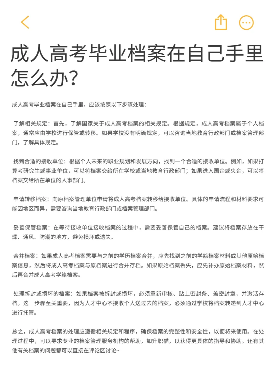总之,成人高考档案的处理应遵循相关规定和程序,确保档案的完整性和安全性,以便将来使用。在处理过程中,可以寻求专业的档案管理服务机构的帮助,如升职猫,以获得更具体的指导和协助。还有其他有关档案的问题都可以直接在评论区讨论~