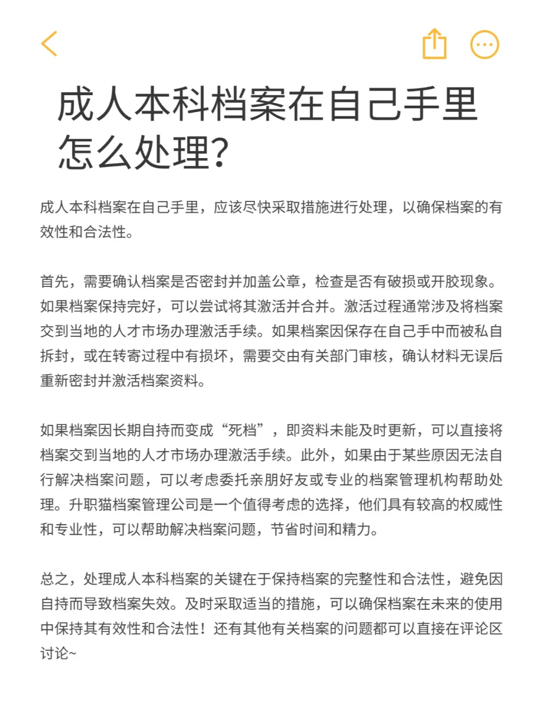 总之,处理成人本科档案的关键在于保持档案的完整性和合法性,避免因自持而导致档案失效。及时采取适当的措施,可以确保档案在未来的使用中保持其有效性和合法性!还有其他有关档案的问题都可以直接在评论区讨论~