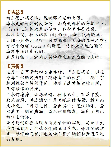 这首诗是借景抒情的名篇,诗人用饱蘸浪漫主义激情的大笔,描写了登山观海所见的景物,勾画了大海吞吐日月、包蕴万千的壮丽景象,表现出诗人开阔的胸襟,抒发了诗人建功立业的宏伟抱负。