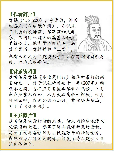 这首诗是曹操《步出夏门行》组诗中最好的两首诗之一,作于汉献帝建安十二年(207年)的秋冬之间。当年五月曹操率军北征乌桓,七月出卢龙塞入辽西,八月大破乌桓于柳城,九月胜利回师,在途经谒石山时,曹操登高望海,写下了《观沧海》。