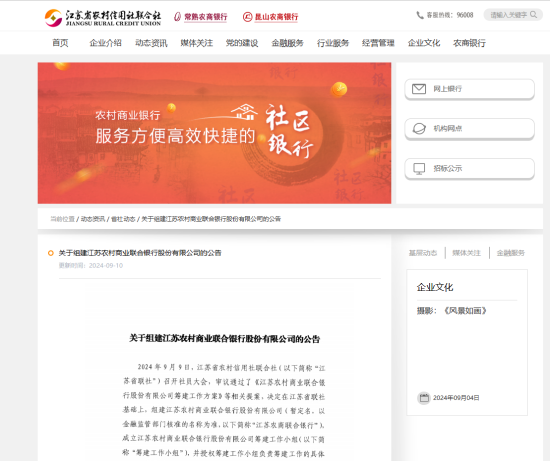 9月10日,江苏省农村信用社联合社(简称:江苏省联社)官网披露消息显示,9月9日,江苏省联社召开社员大会,审议通过《江苏农村商业联合银行股份有限公司筹建工作方案》等相关提案,决定在江苏省联社基础上组建江苏农村商业联合银行(暂定名,以金融监管部门核准的名称为准)。此外,消息显示,决定启动江苏农商联合银行组建工作。