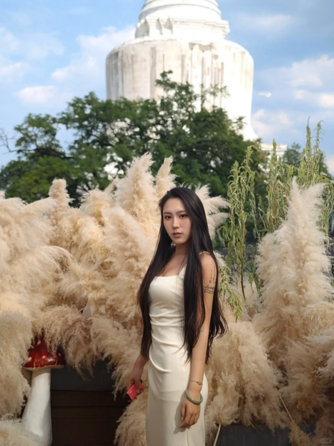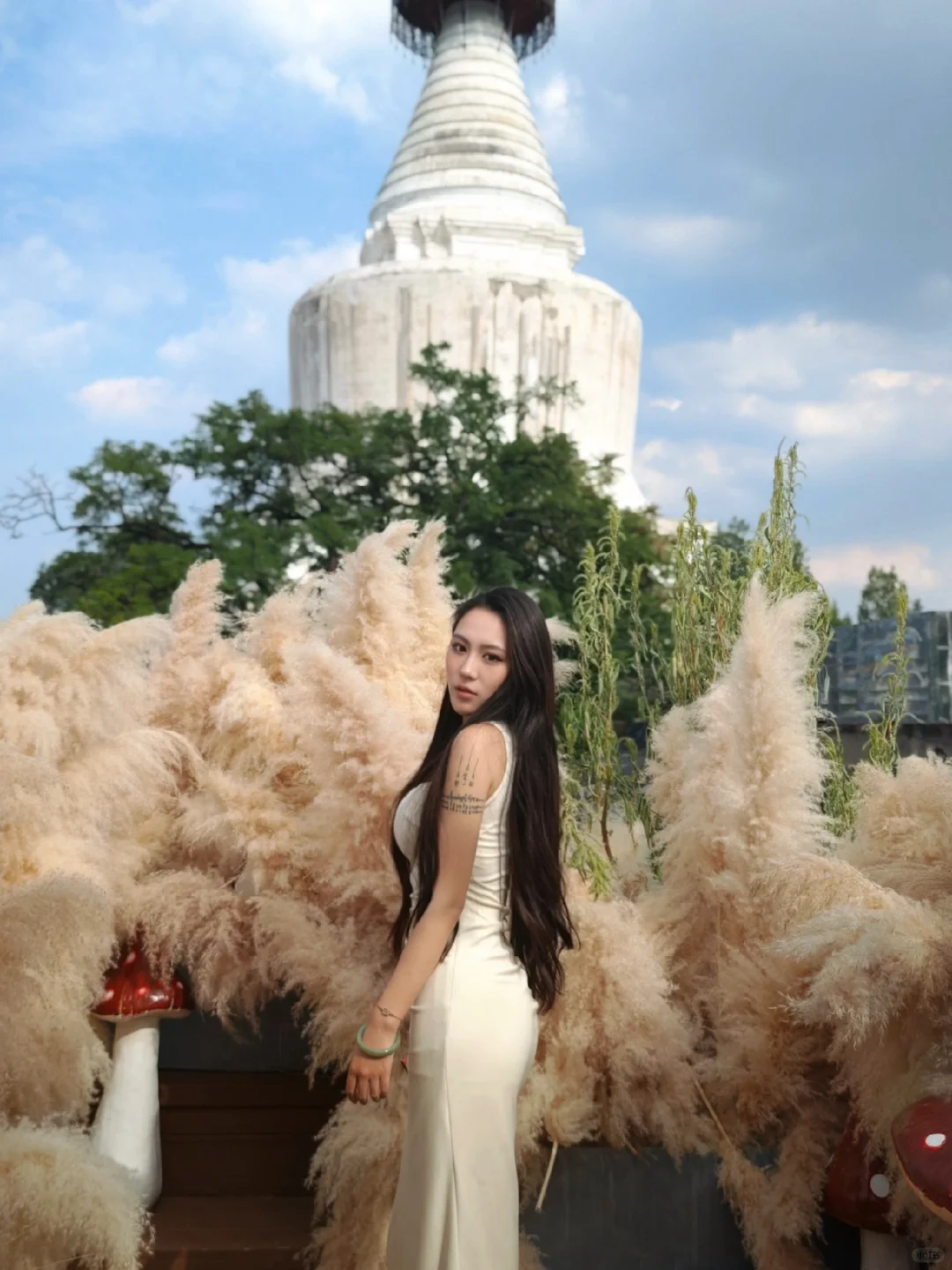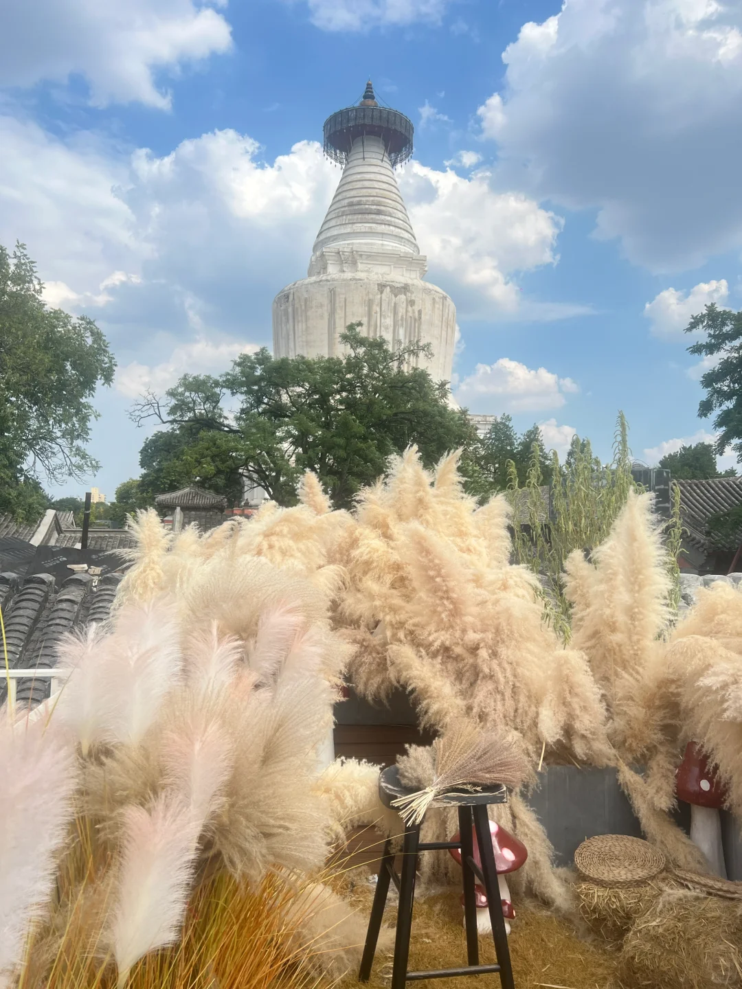 芦苇、小红蘑菇和背后的白塔交相辉映,偶尔童话一下~ 是属于北京独有的秋天 📍JM Cafe