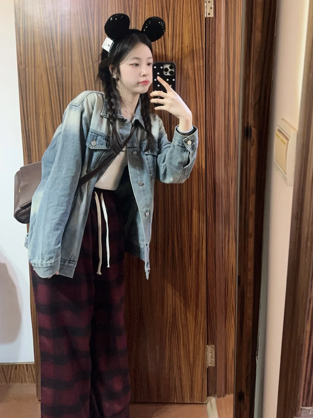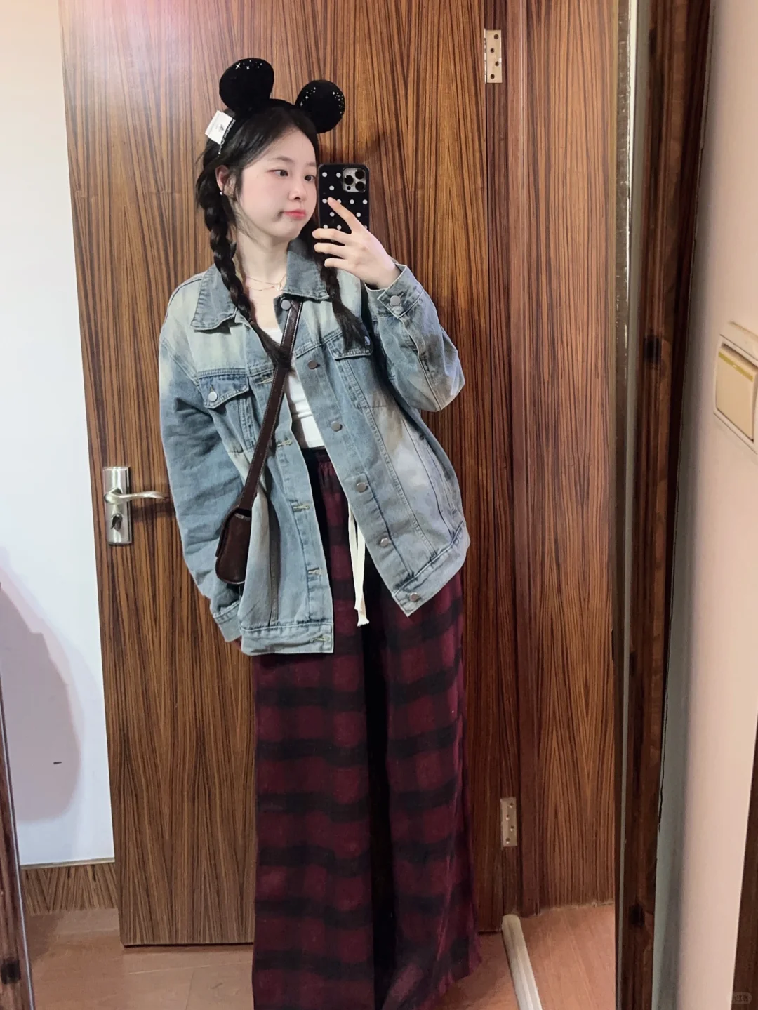 牛仔外套有点褪色墨白,版型宽松带慵懒感但不压个子,搭配复古红格纹直筒裤,舒适休闲,很韩系mm的一套~