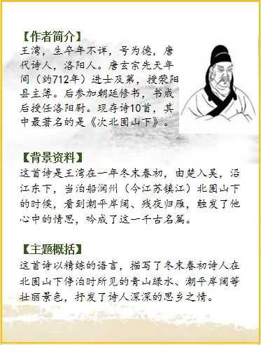 这首诗是王湾在一年冬末春初,由楚入吴,沿江东下,当泊船润州(今江苏镇江)北固山下的时候,看到潮平岸阔、残夜归雁,触发了他心中的情思,吟成了这一千古名篇。