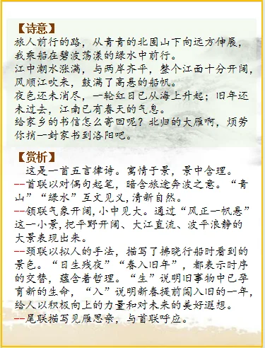 这首诗以精练的语言,描写了冬末春初诗人在北固山下停泊时所见的青山绿水、潮平岸阔等壮丽景色,抒发了诗人深深的思乡之情。