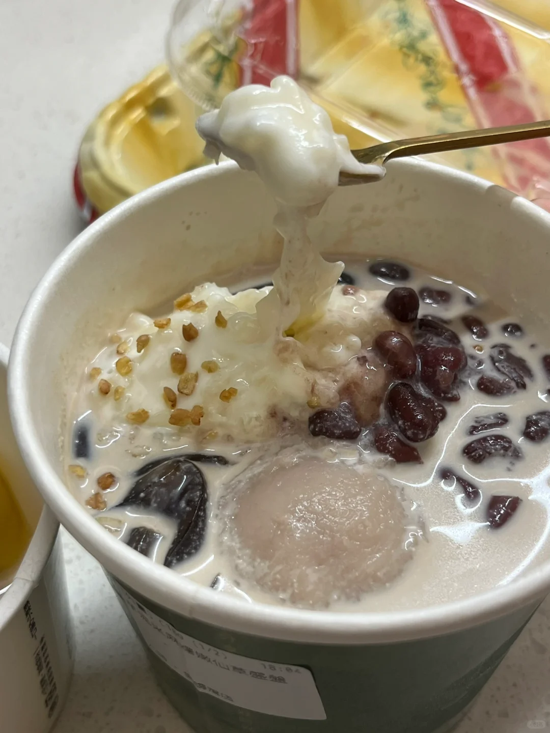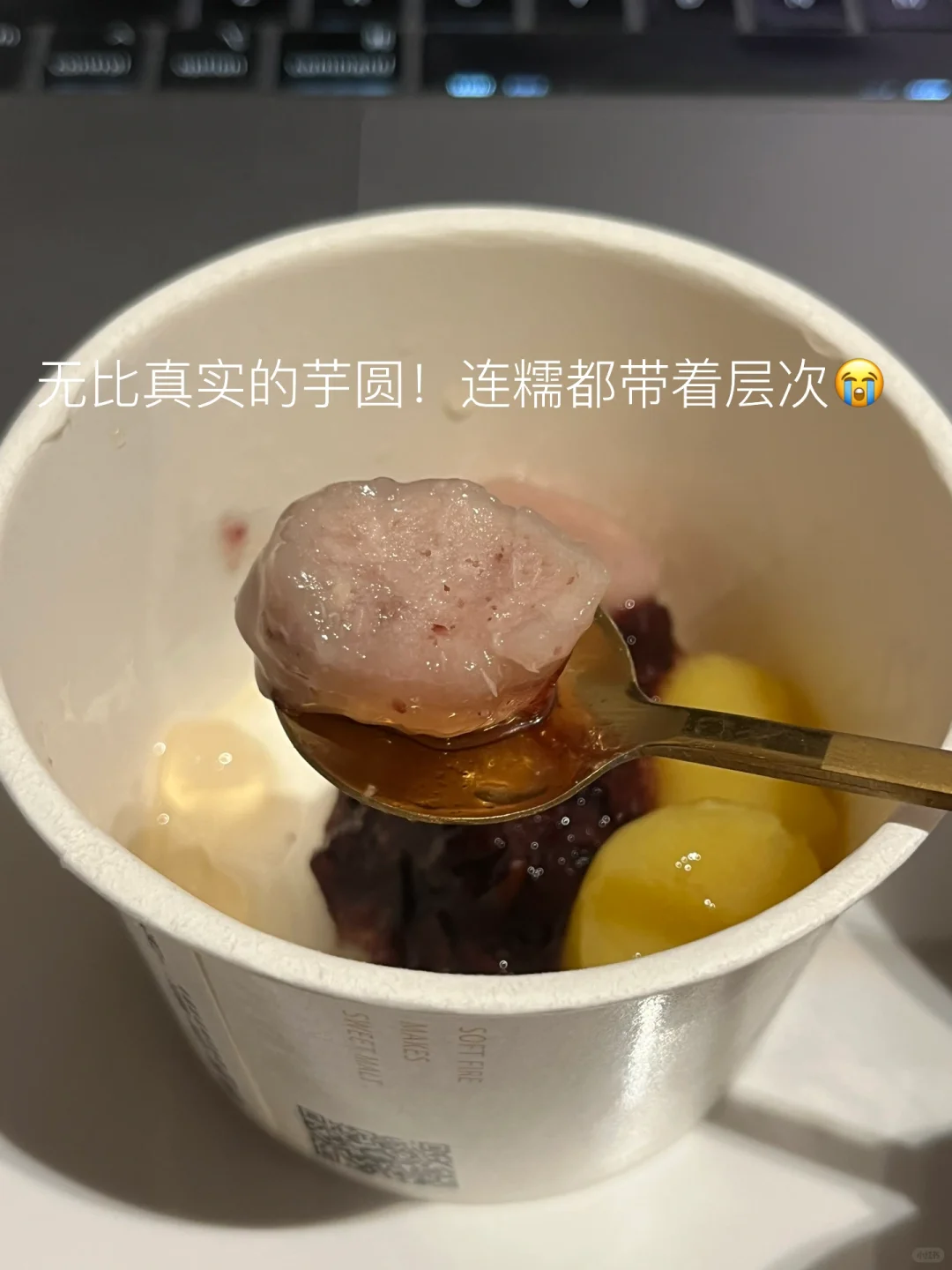 芋圆,绝了,超级软糯啊啊啊。并且它的糯是带着层次的,是一层糯糯的皮包裹着内馅的糯。咬开可以清晰地看到芋圆生前的颗粒?