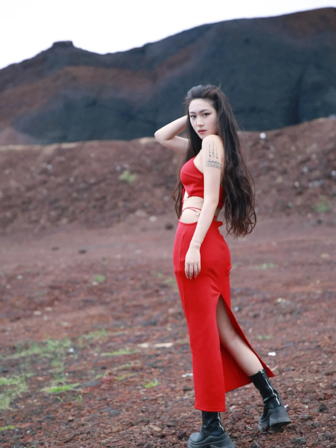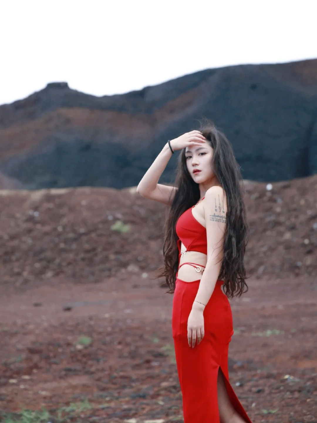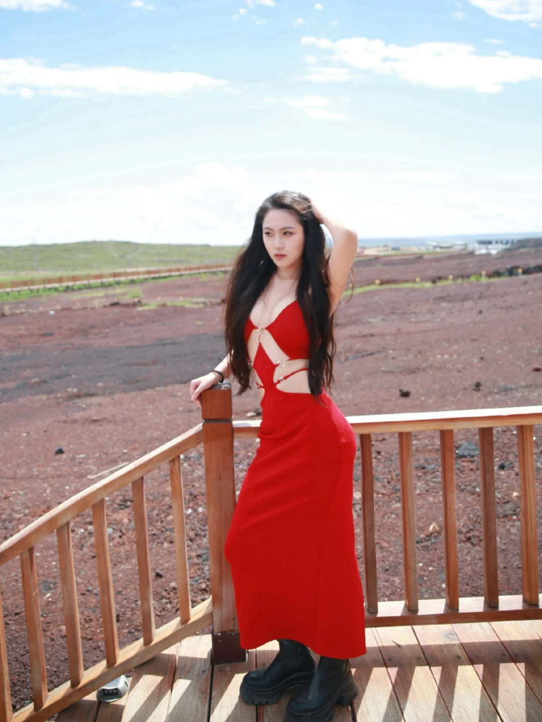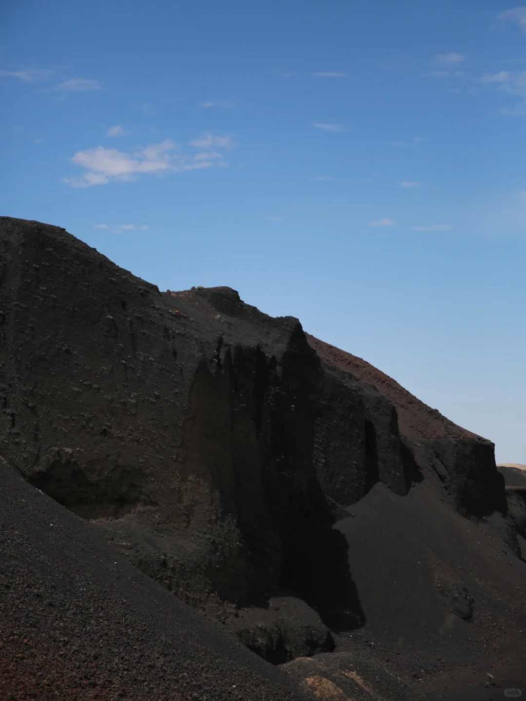6号火山黑色的砂石密布,被称为“南炼丹炉”。巨大的山体露出黑色的火山岩,犹如置身于火星。 熔岩冷却后形成的岩石,密布的那些裂痕和沟壑,仿佛火山正在喷发。 乌兰在蒙古语意为红色。就让我用红色的衣服向自然献礼。