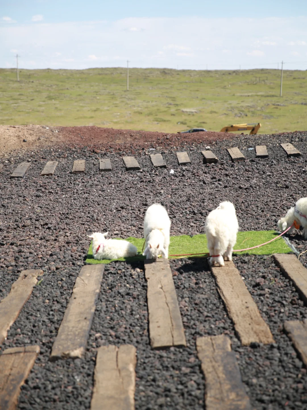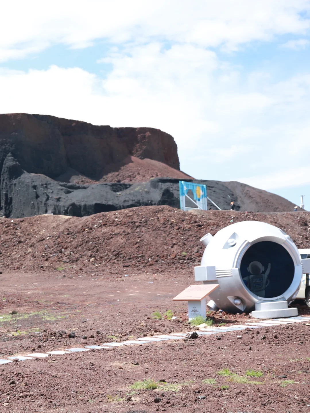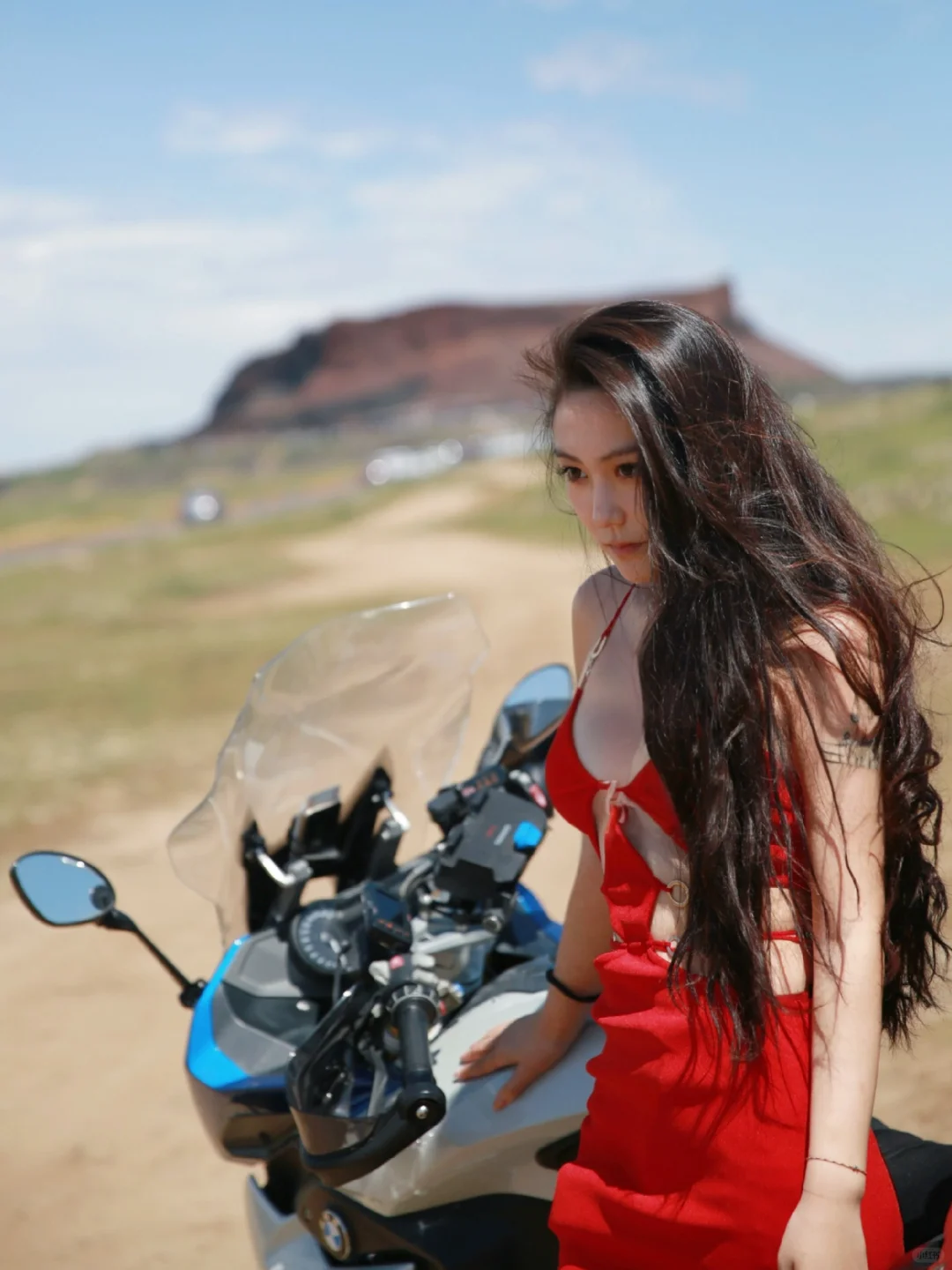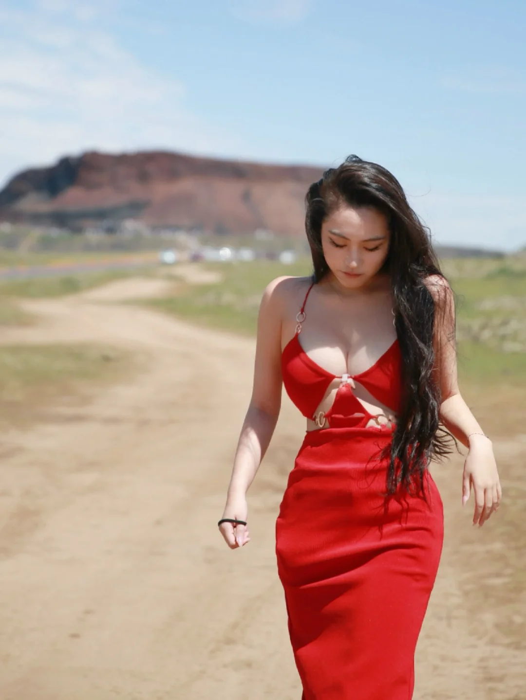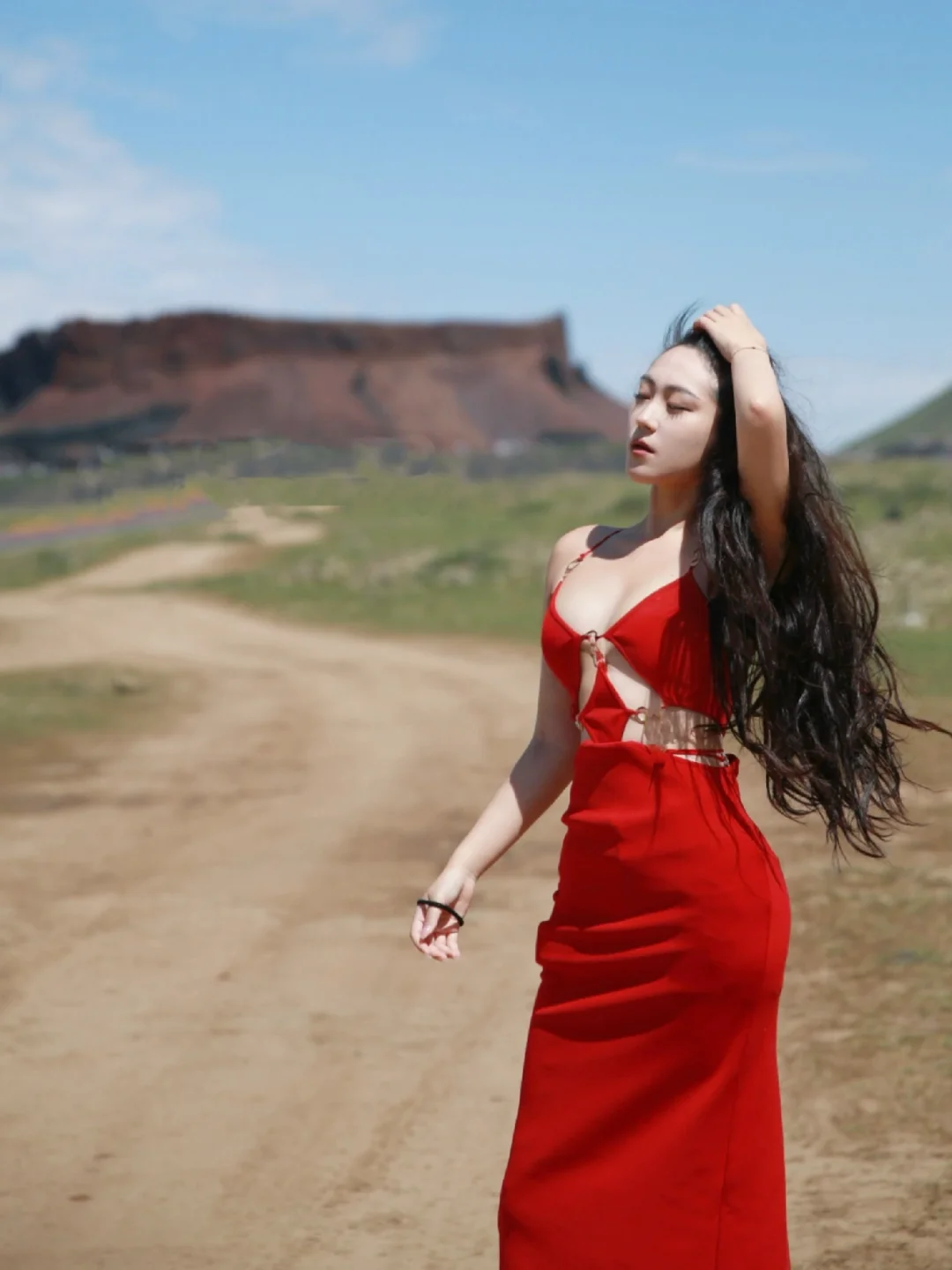 6号火山黑色的砂石密布,被称为“南炼丹炉”。巨大的山体露出黑色的火山岩,犹如置身于火星。 熔岩冷却后形成的岩石,密布的那些裂痕和沟壑,仿佛火山正在喷发。 乌兰在蒙古语意为红色。就让我用红色的衣服向自然献礼。