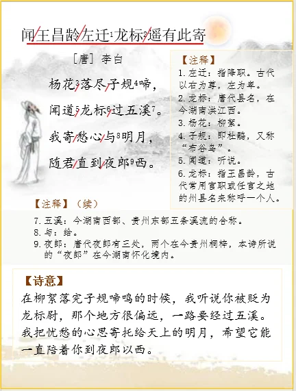 在柳絮落完子规啼鸣的时候,我听说你被贬为龙标尉,那个地方很偏远,一路要经过五溪。