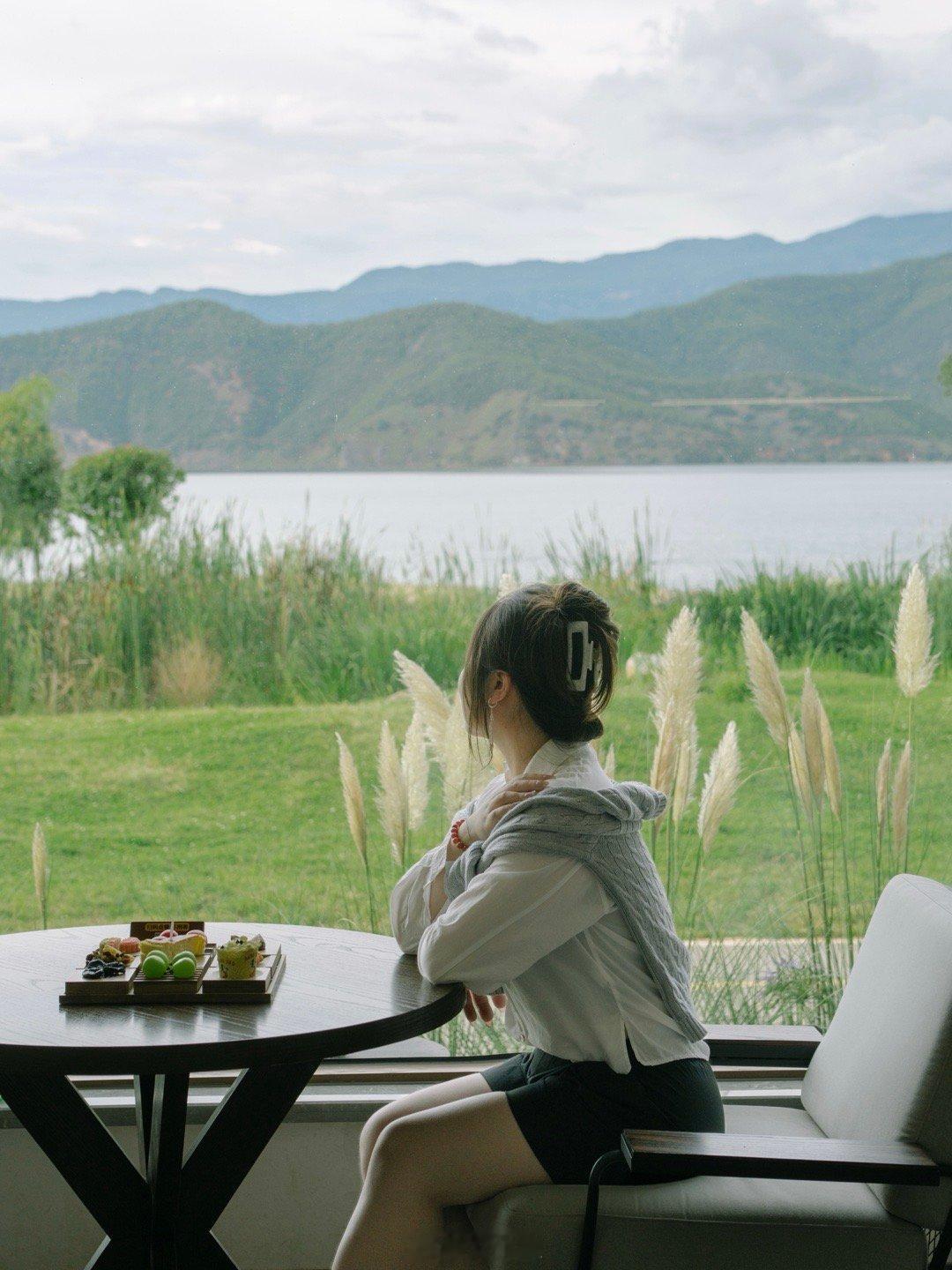 那天在网上无意看到这家酒店的这扇落地窗,一眼就被深深吸引,巨大的落地窗对着湖面和女神山,于是,我们立刻定了飞往云南的票。