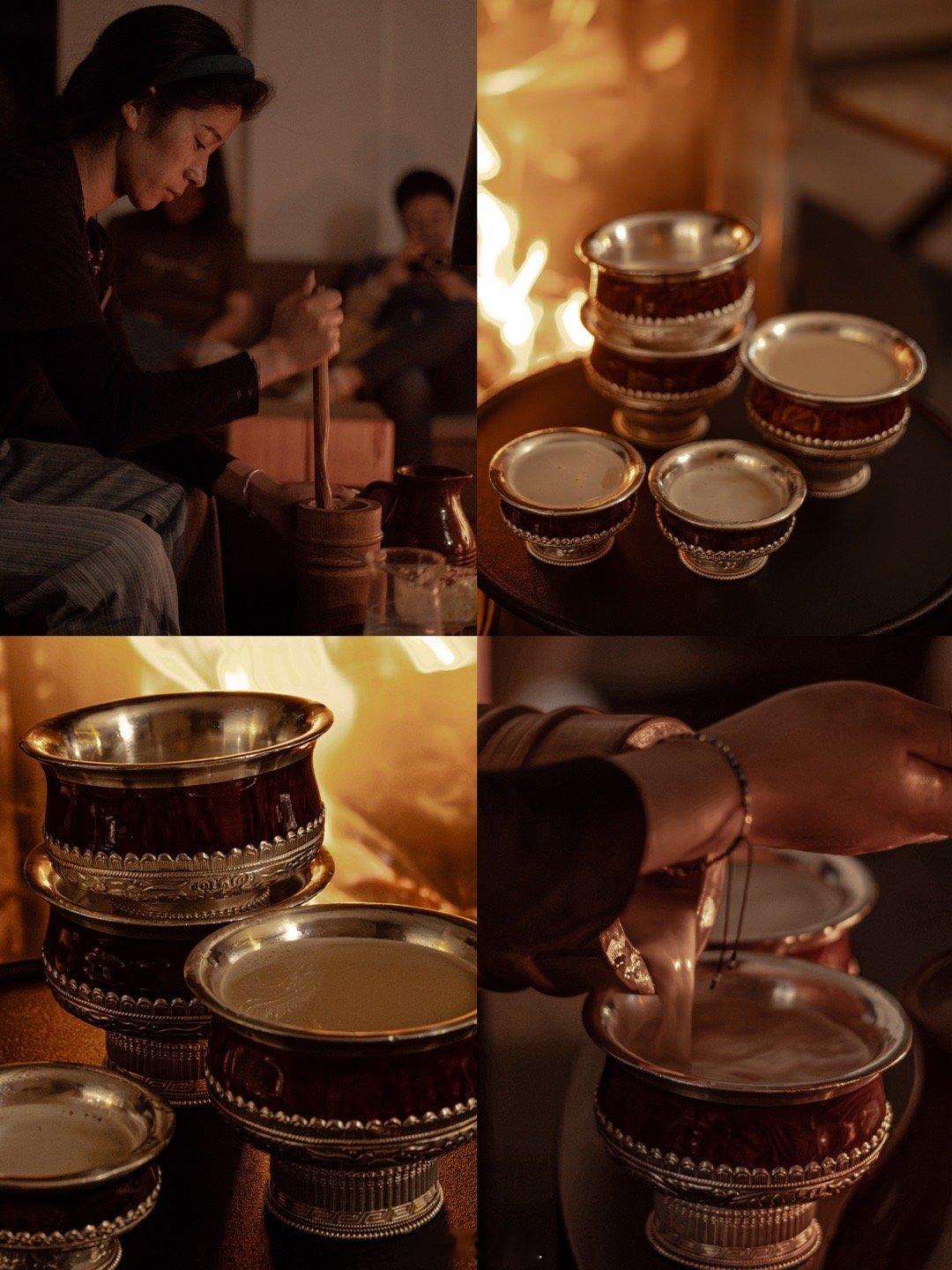 这是酒店组织的很温馨的一个小活动,晚上天黑之后,在大堂吧一角,点上火炉,放着电影,准备好了水果和小食,店员小姐姐就在这里亲自给客人做酥油茶,会热情的邀请每位客人来参与,此时此刻大家围坐在一起聊着天,就好像一个温暖的大家庭~