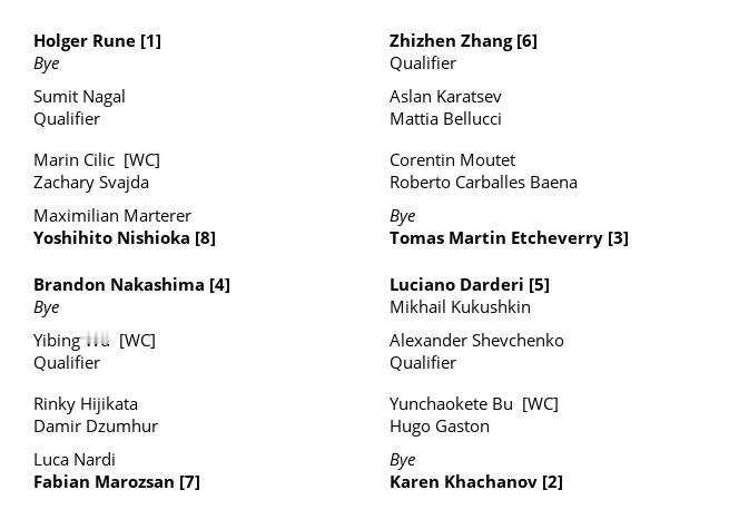 杭州250赛由鲁内、卡恰诺夫、埃切维里和中岛布兰登领衔出战,中国选手签表如下: