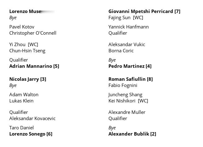 成都250赛前四种子分别是穆塞蒂、布勃里克、贾里和马丁内斯,中国选手的签表如下: