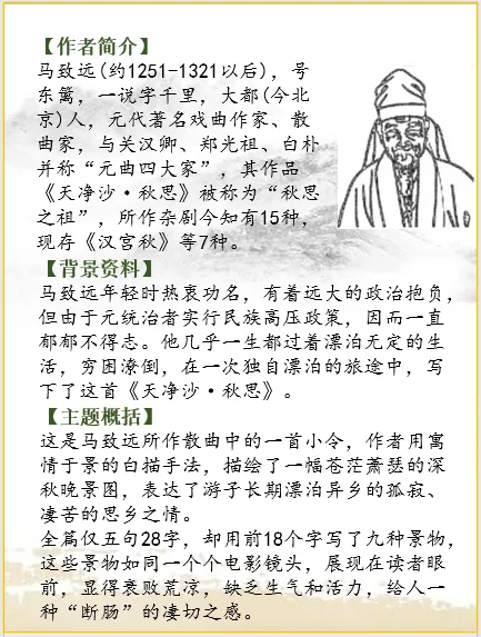 马致远(约1251-1321以后),号东篱,一说字千里,大都(今北京)人,元代著名戏曲作家、散曲家,与关汉卿、郑光祖、白朴并称“元曲四大家”,其作品《天净沙·秋思》被称为“秋思之祖”,所作杂剧今知有15种,现存《汉宫秋》等7种。