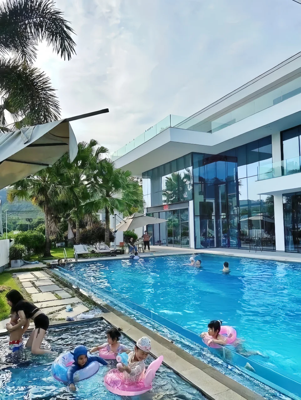 ✨超大无边泳池➕温泉泡池♨️庭院私人泳池私密性超好👍🏻畅快玩水无负担🥳玩水之后再往温泉泡池里一坐♨️真的好舒服🥰小孩玩水也不会怕着凉了🧊