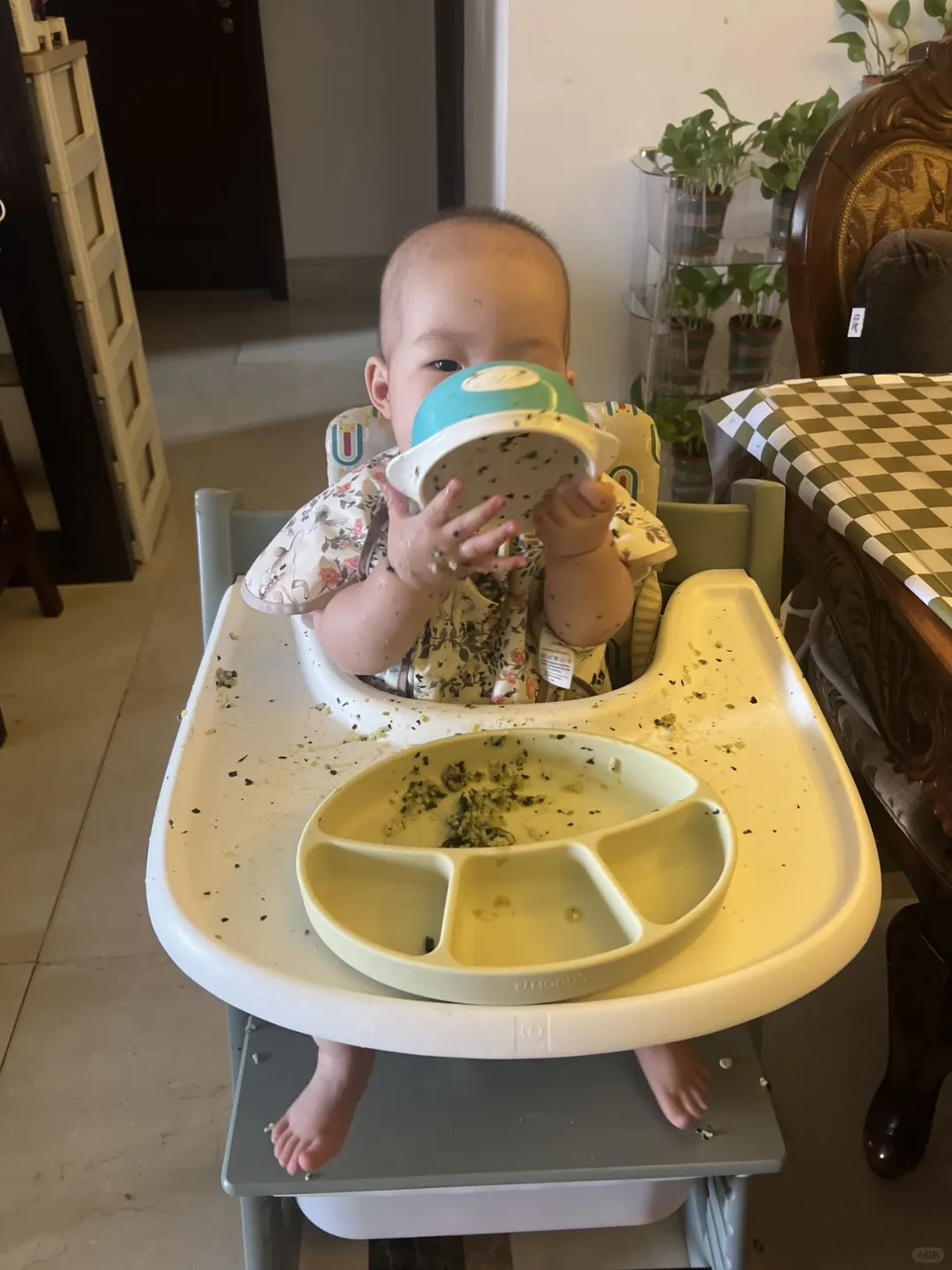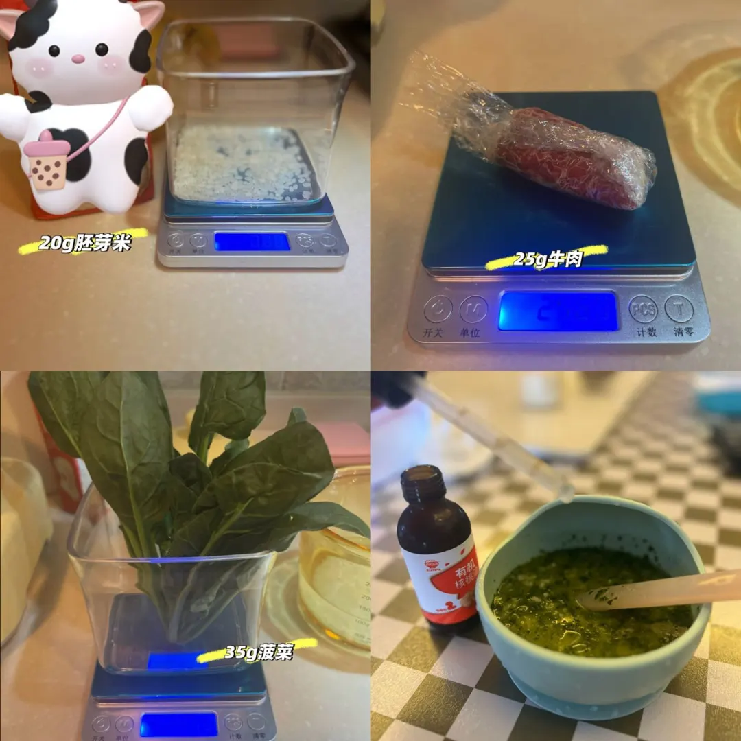 添加辅食已经两个月了,今天给宝宝安排第一口十倍粥。幼崽不太接受勺喂,喜欢端起来大口炫,主打一个越随意,自主进食越快。 食材准备:胚芽米20g、牛肉25g、菠菜35g、核桃油 所有食材洗干净放入炖锅中,加入适量的清水,炖煮 吃之前滴一点辅食油,吃的特别香