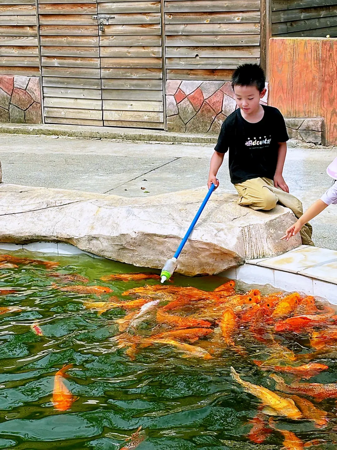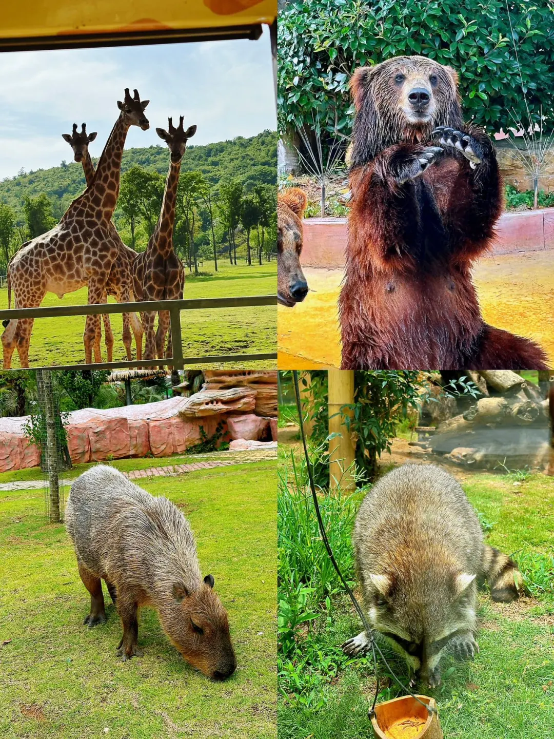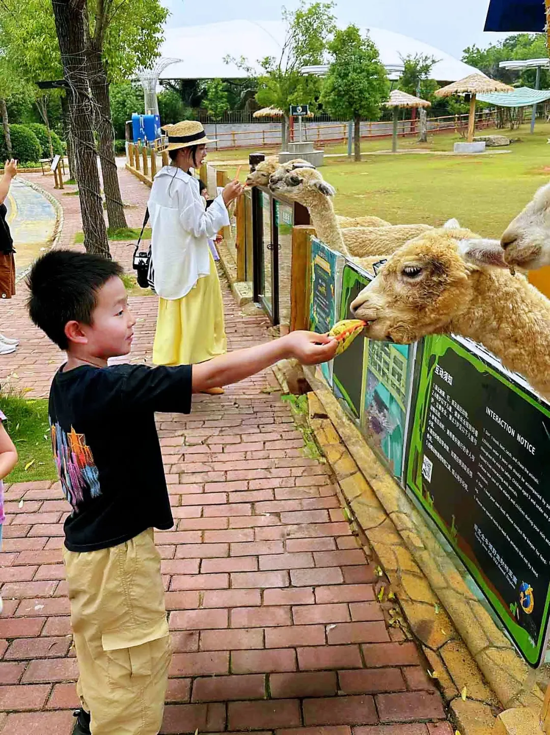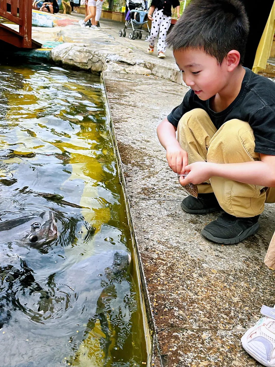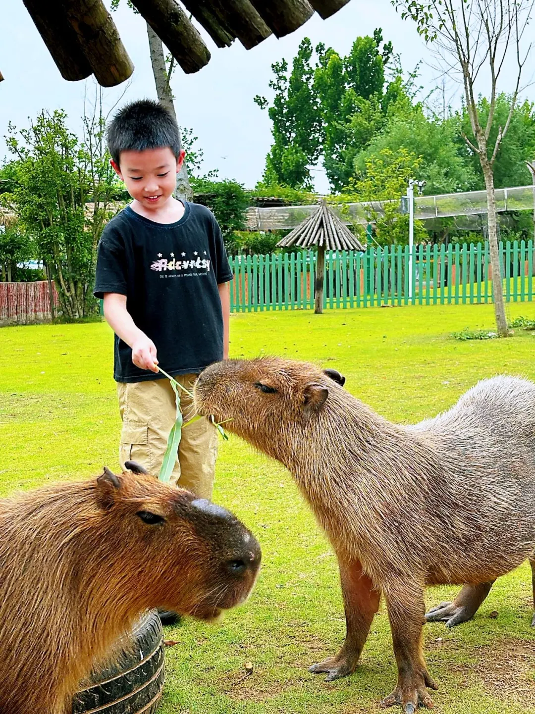 从南门进入这片园区,在开心牧场边上的萌宠乐园我们参与了一场别开生面的苏卡达龟研学活动,洗刷刷了龟壳~结束后往右边走看到长颈鹿和河马后,邂逅了近期网络上的热门明星“卡皮巴拉”。小七同学与它们互动喂食时,水豚展现出的呆萌可爱模样,让人情不自禁地想去触摸它们那独特的硬质毛发,一点脾气都没有。而在拐过去后,小七同学亲手喂养了身高几乎达到他三分之二的巨型青鱼,看着那些成群结队、胖墩墩的红鲤鱼,场面既壮观又有趣。还有大熊,黑熊,小熊猫都超会打招呼哈哈。