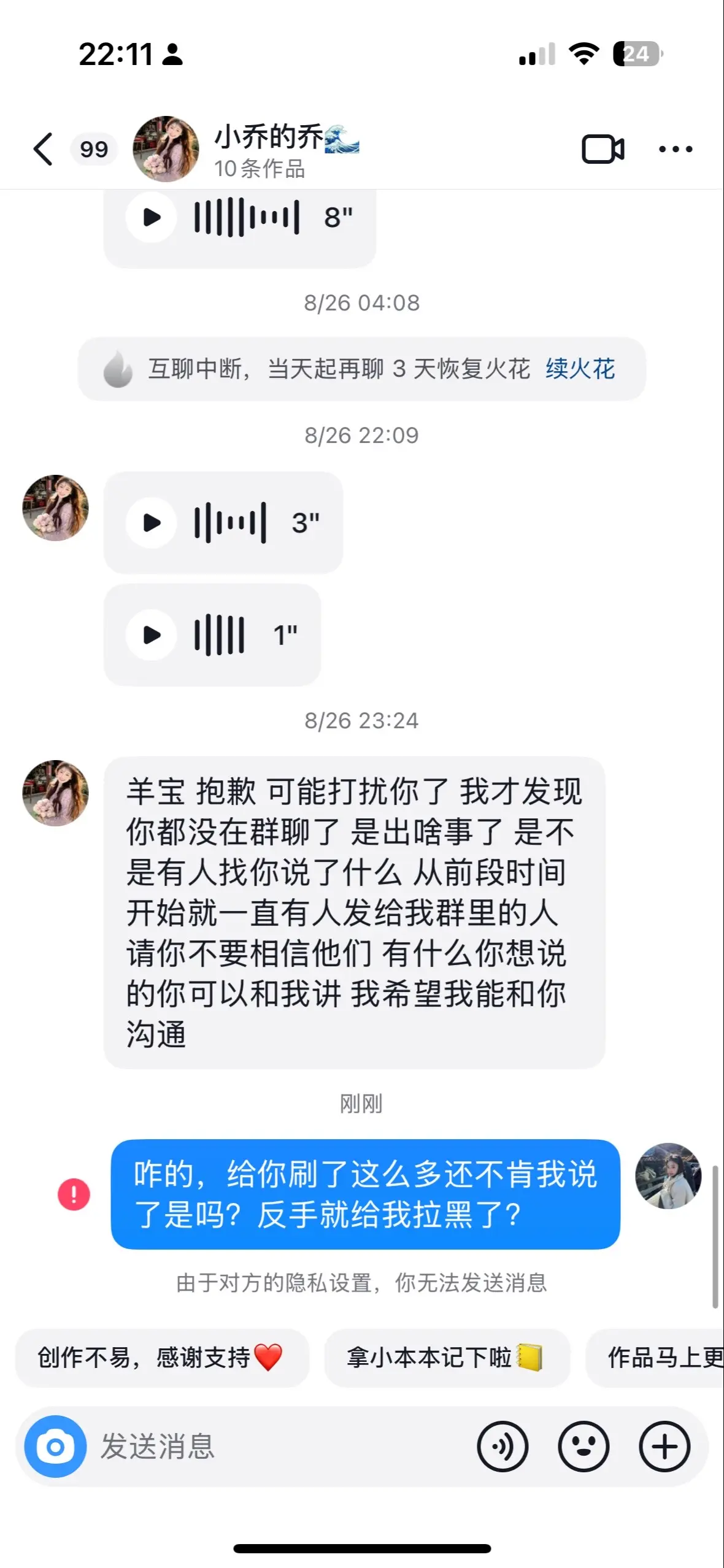 熊猫滚滚你们没有心 刷了快1w反手就给我拉黑了? 主播 小乔的乔 黑料巨多 还爱立虚假人设 学的体育舞蹈说自己学拉丁的😀 所以你们就是这么对以前的大哥大姐是吗 换个号到你们直播间也被拉黑 我相信发出来会有人给我个说法的😀