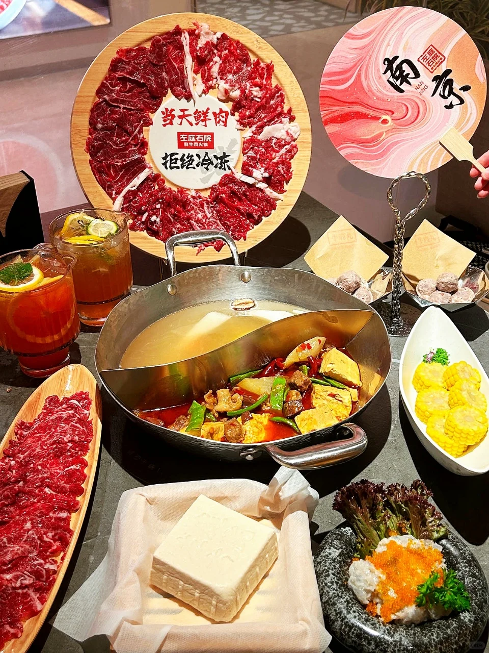 没有什么事,是一顿火锅🍲解决不了的。不用跑河西,在江南虹悦城也可以吃到心心念念的左庭右院鲜牛肉火锅了🥳 透明开放式的玻璃操作间,上演着现代版庖丁解牛,特别的新鲜,能做到立盘不倒,肉质鲜嫩。口感鲜嫩多汁,搭配上灵魂酱料沙茶酱,一口下去,简直鲜掉眉毛啊🤤 ✅牛魔王拼盘🥩 选择恐惧症不纠结! 一次可以吃到 3 种不同部位的现切牛肉,色泽鲜润,充分展现出现切牛肉的新鲜,口感鲜嫩多汁 ✅烤牛肉串🍖 肥瘦相间的牛肉,块大肉鲜,烤的外焦里嫩,一口下去鲜嫩多汁,