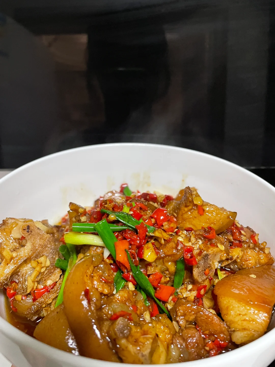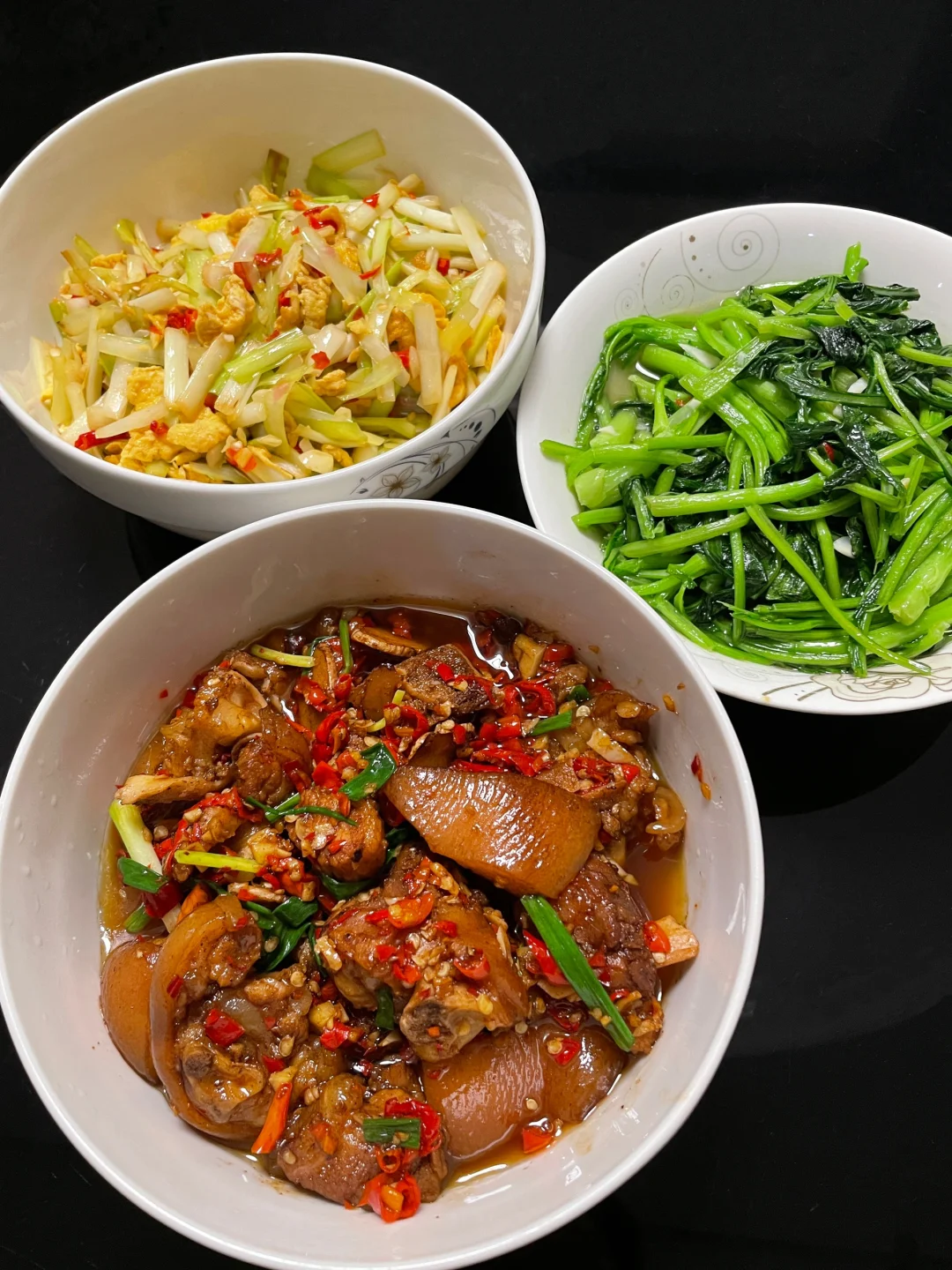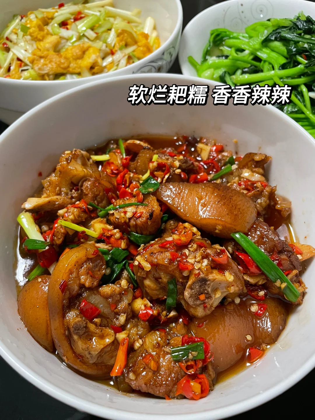 今日菜谱🥬 国公香辣猪蹄 韭黄炒蛋 炒菜心 我宣布今日最佳就是这个国公香辣猪蹄,Q弹软糯,香辣入味,简直就是米饭杀手![喝奶茶R] 和以往辣炒的做法略微不同,好吃的秘诀就是用水炖煮猪蹄时加国公酒,去腥的同时,猪蹄变得醇香可口,高压锅焖制后口感也更好,软烂耙糯[哇R] 再加小米辣、配菜爆炒,一口下去,脂香四溢。吃完还唇齿留香呢,真是绝绝子!简直快要给我香晕了 教程安排上了,爱吃猪蹄的宝子赶快试试[自拍R]