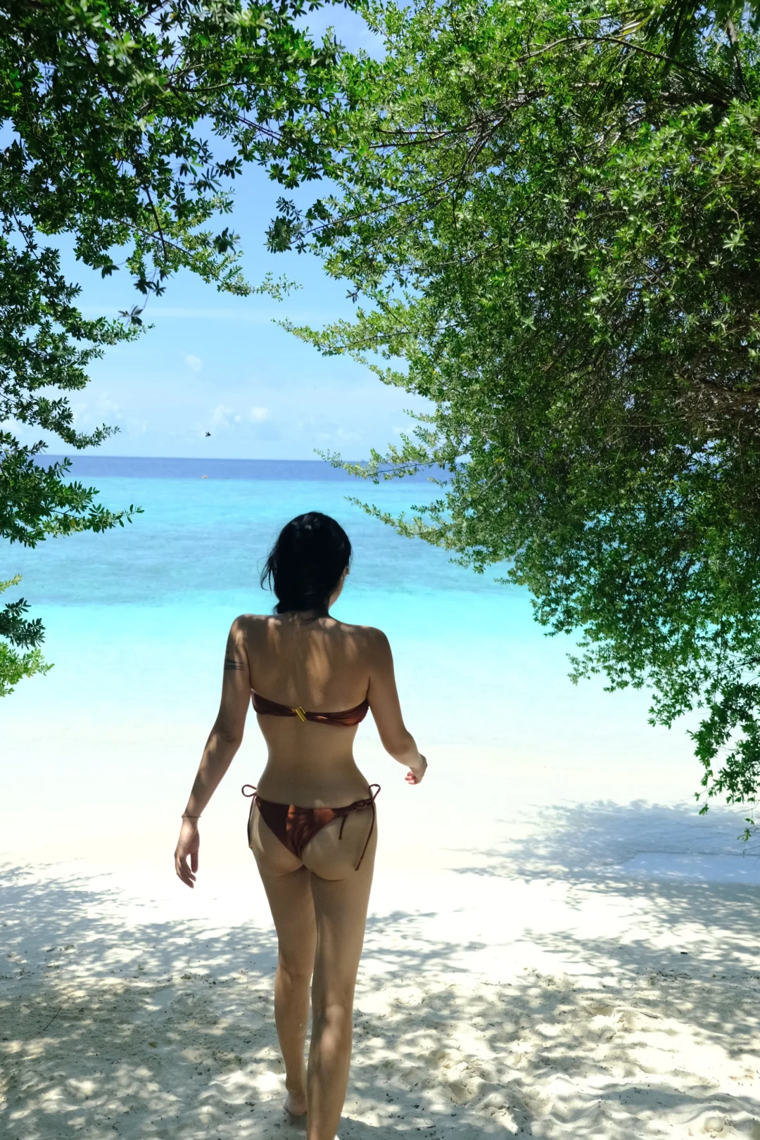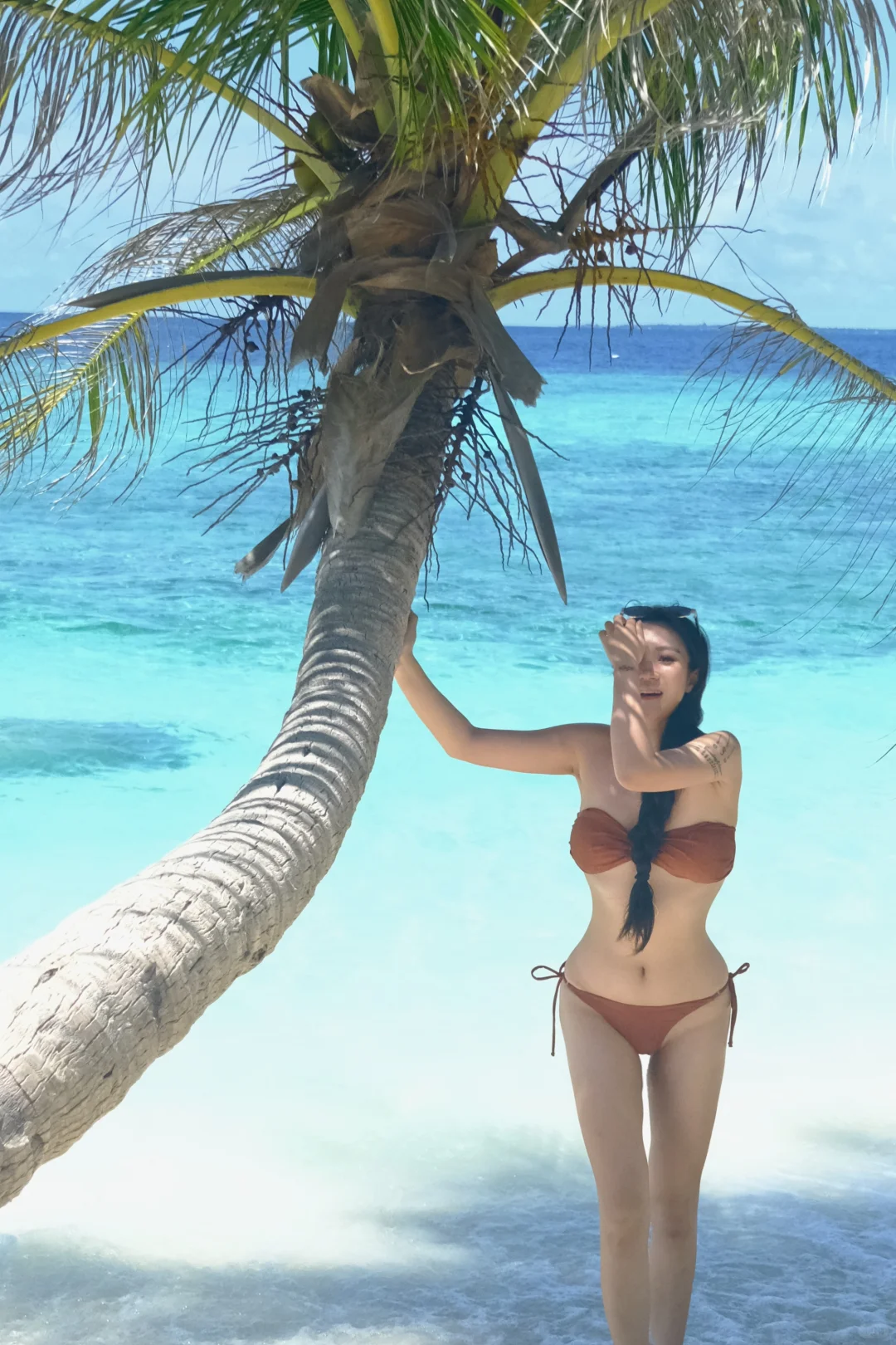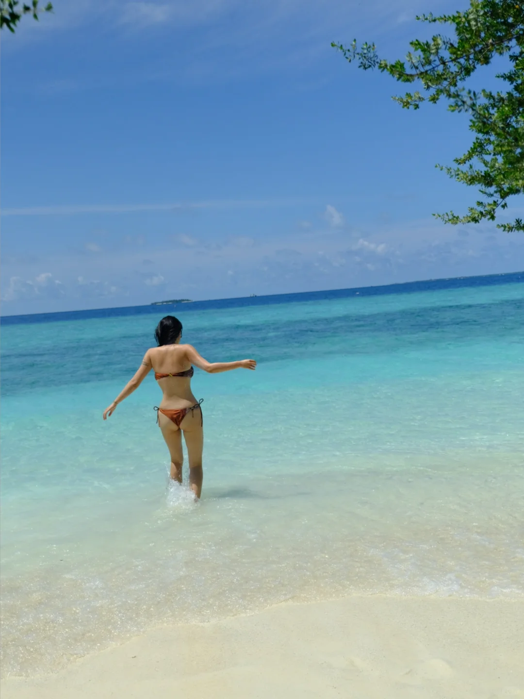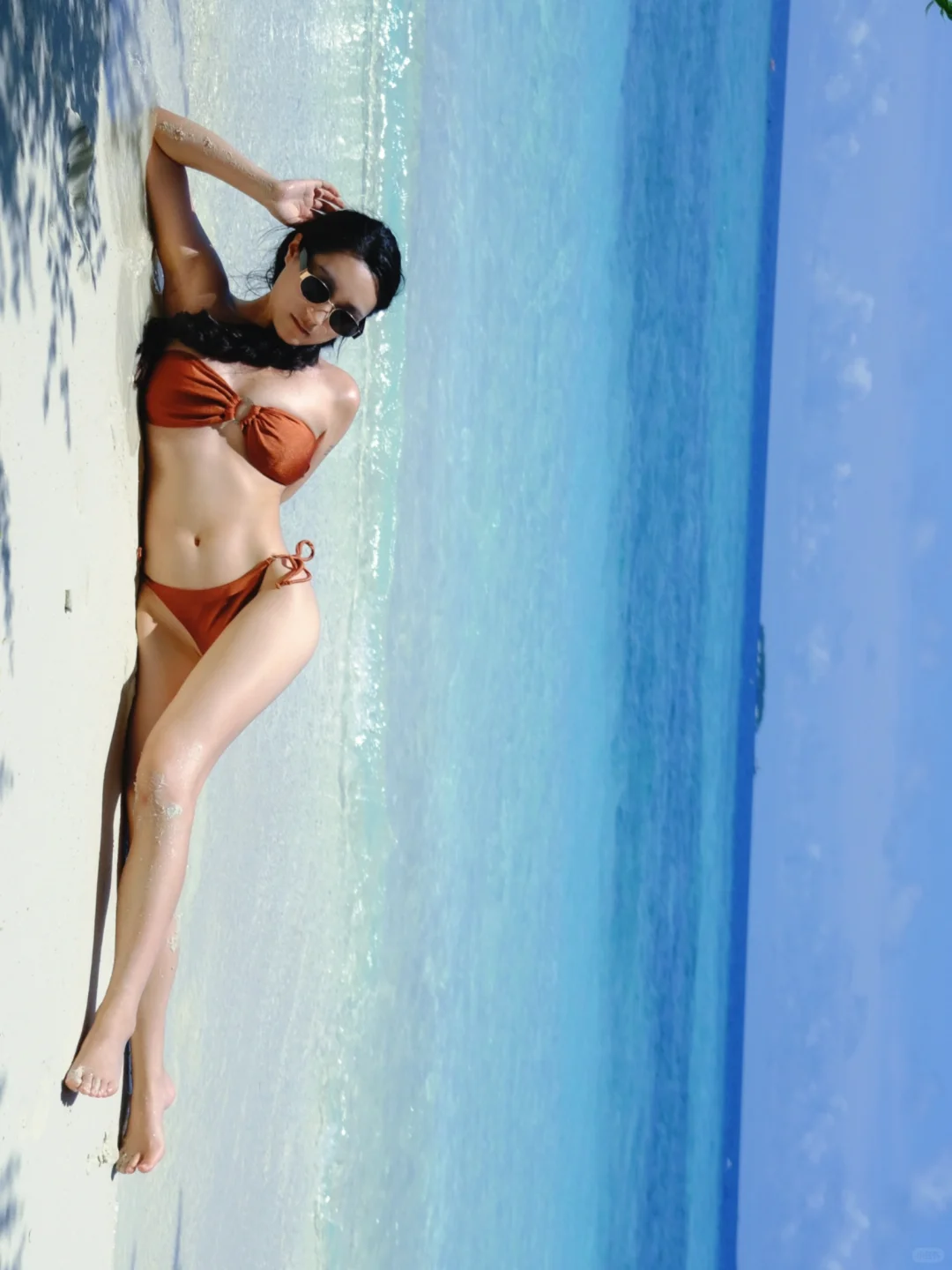 海边一定要配亮色或者饱和度比较高的比基尼👙 和大海的颜色形成鲜明的对比~ 马代的阳光妥妥拍照五分钟晒黑三个度,已经往tan的方向发展了 (尊敬的审核员是海边正常穿搭,无任何不良指导!