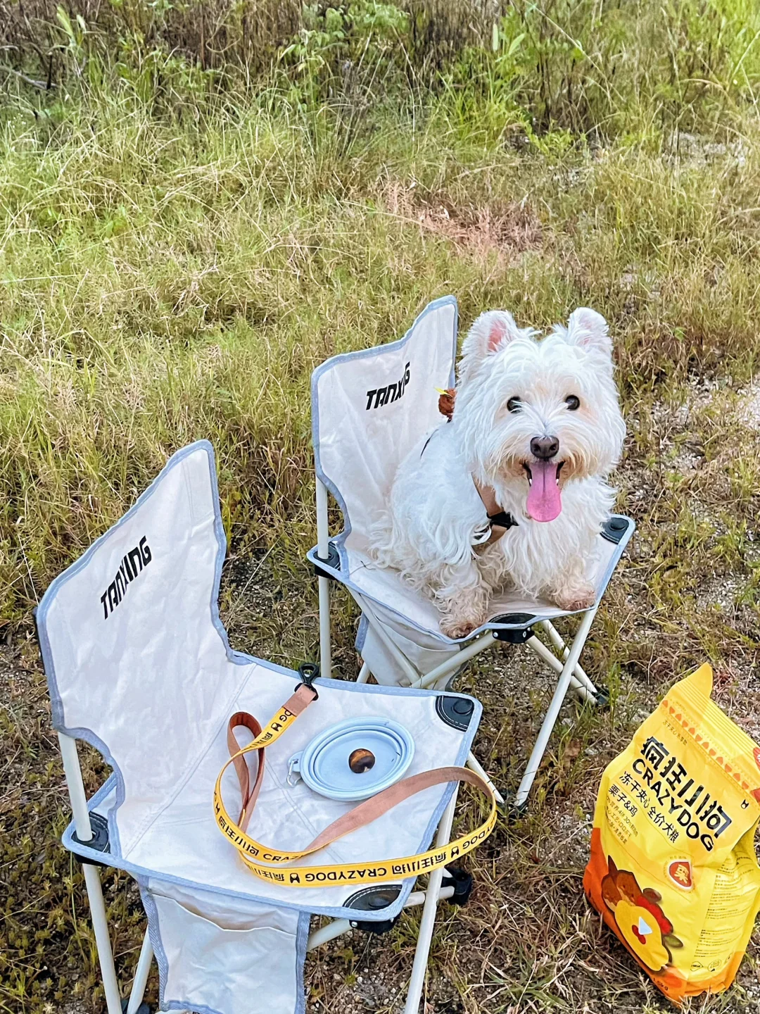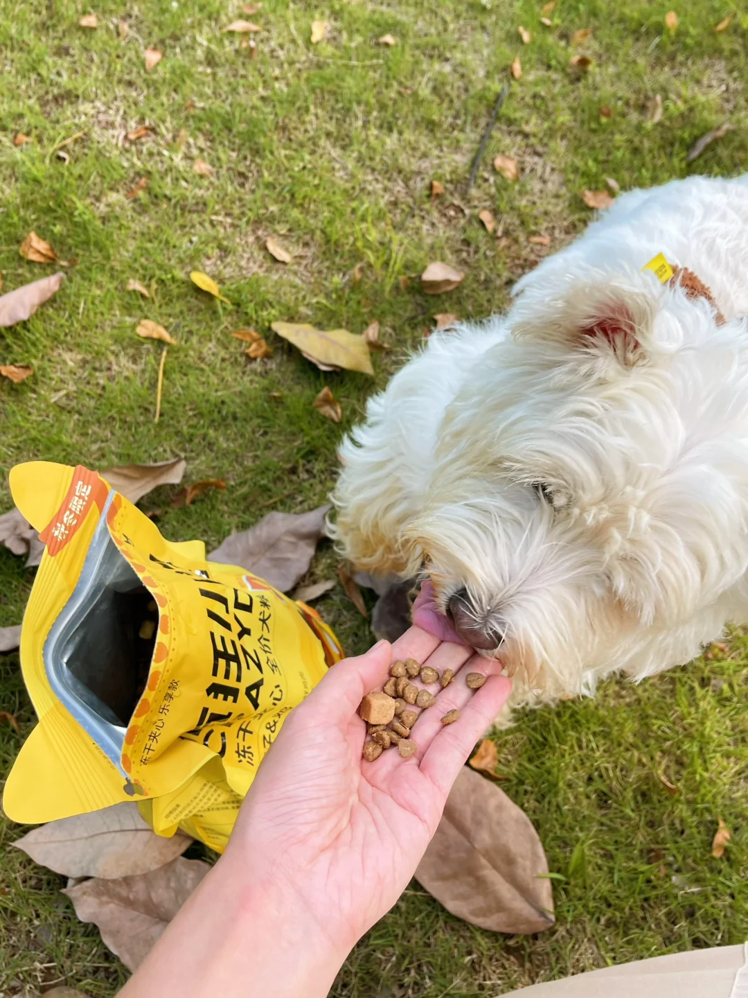 我们一路徒步,找了个欣赏风景的好地儿休息,我掏栗子吃,给它也倒上了秋冬限定的栗子鸡夹心粮,里面还有整颗的栗子冻干