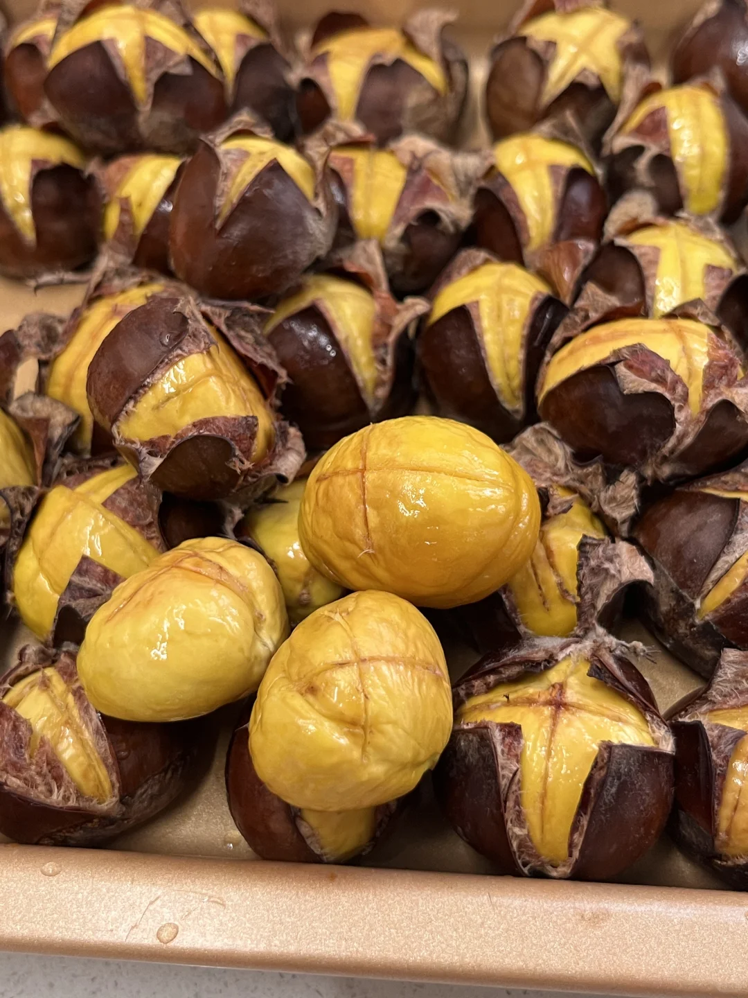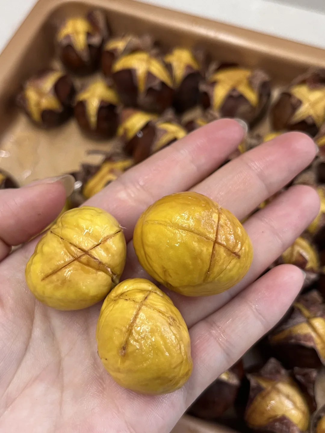 🌟做法: 1️⃣板栗洗净,切十字(小心手),锅中放水,加少许盐,放入板栗煮20分钟捞出 2️⃣表面刷油,放入空气炸锅180度烤10分钟 3️⃣调蜂蜜水:蜂蜜和水比例1:1,刷在板栗上,再烤5分钟✅ -